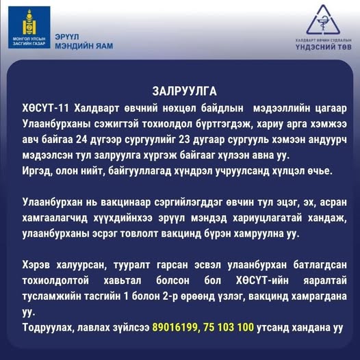 Хэрэв халуурсан, тууралт гарсан эсвэл улаанбурхан батлагдсан тохиолдолтой хавьтал болсон бол ХӨСҮТ-ийн яаралтай тусламжийн тасгийн 1 болон 2-р өрөөнд үзлэг, вакцинд хамрагдана уу.