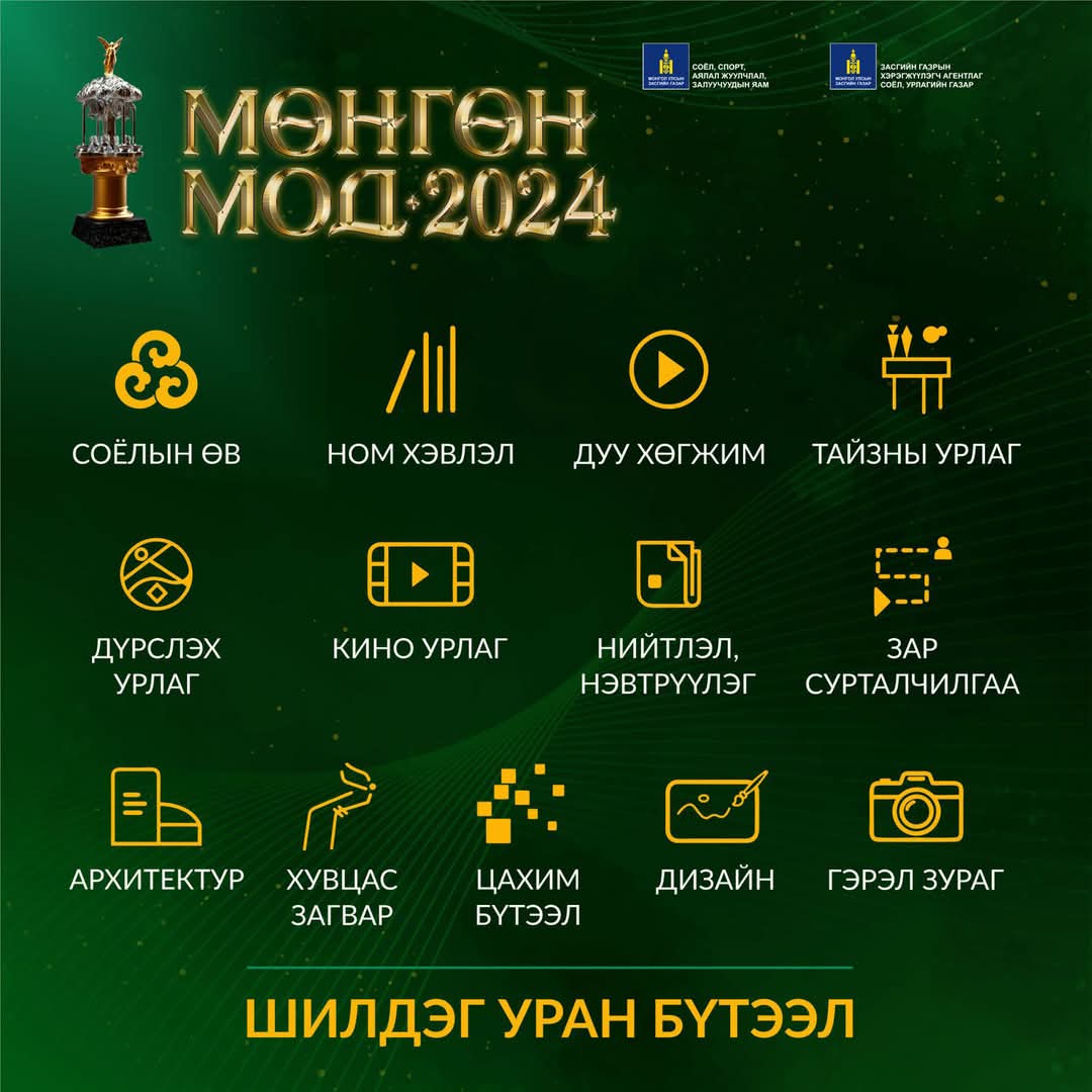 16 дахь жилдээ зохион байгуулагдаж буй “Мөнгөн мод-2024” наадмын хүрээнд соёлын өв, ном хэвлэл, дуу хөгжим, тайзны урлаг, дүрслэх урлаг, кино урлаг, нийтлэл нэвтрүүлэг, цахим бүтээл, архитектур, дизайн, хувцас загвар, зар сурталчилгаа гэсэн төрлөөр шилдэг бүтээл, шилдэг уран бүтээлчдийг найруулагч, зураач, зохиолч, хөгжмийн зохиолч, продюсер, удирдаач, бүжиг дэглээч, жүжигчин, хөгжимчин, дуучин, бүжигчин, судлаач төрлөөр тодруулах юм.