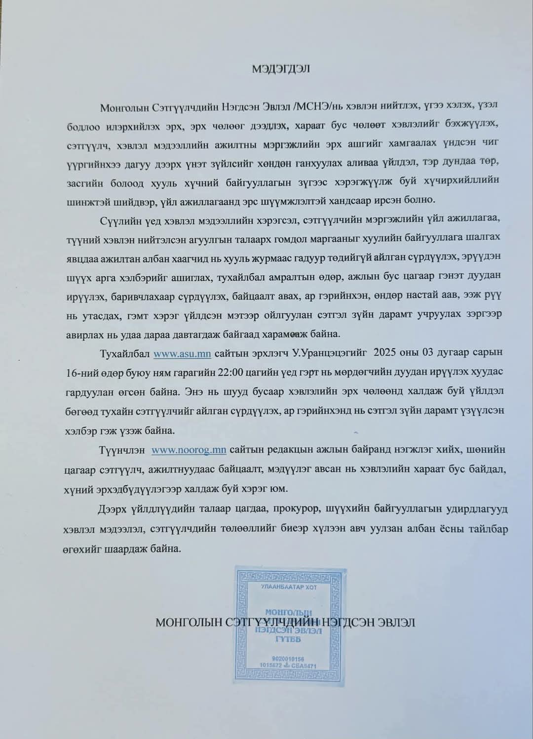 Түүнчлэн www.noorog.mn сайтын редакцын ажлын байранд нэгжлэг хийх, шөнийн цагаар сэтгүүлч, ажилтнуудаас байцаалт, мэдүүлэг авсан нь хэвлэлийн хараат бус байдал, хүний эрхэд бүдүүлгээр халдаж буй хэрэг юм.