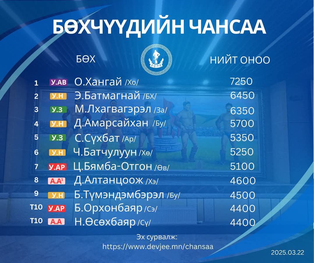 “Наурызын баяр”-т зориулсан Улс, аймаг, цэргийн алдар цолтой хүчит 128 бөхийн барилдааны дараа чансаа шинэчлэгдлээ.