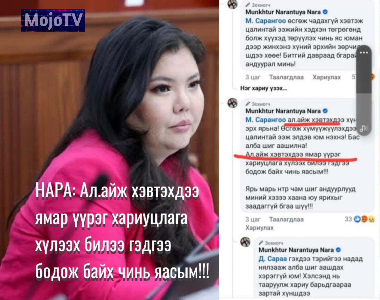 УИХ-ын гишүүн М.Нарантуяа-Нара “Цалинтай ээж”-ийн 50.000 төгрөгийг 500.000 төгрөг болгох асуудал дээр иргэдэд ингэж байр сууриа илэрхийллээ. Нара: Ал.айж хэвтэхдээ ямар үүрэг хариуцлага хүлээх билээ гэдгээ бодож байх чинь яасым!!! Ярь марь нтр чам шиг андуурлууд миний хэзээ хаана юу ярихыг заадаггүй байгаа шүү!!! гэх мэтээр иргэд, эхчүүдийн төлөөлөлтэй төрийн түшээ, УИХ-ын гишүүний ёсзүйг уландаа гишгэн бүдүүлэг харьцсанд олон нийт шүүмжлэлтэй хандаж байна.