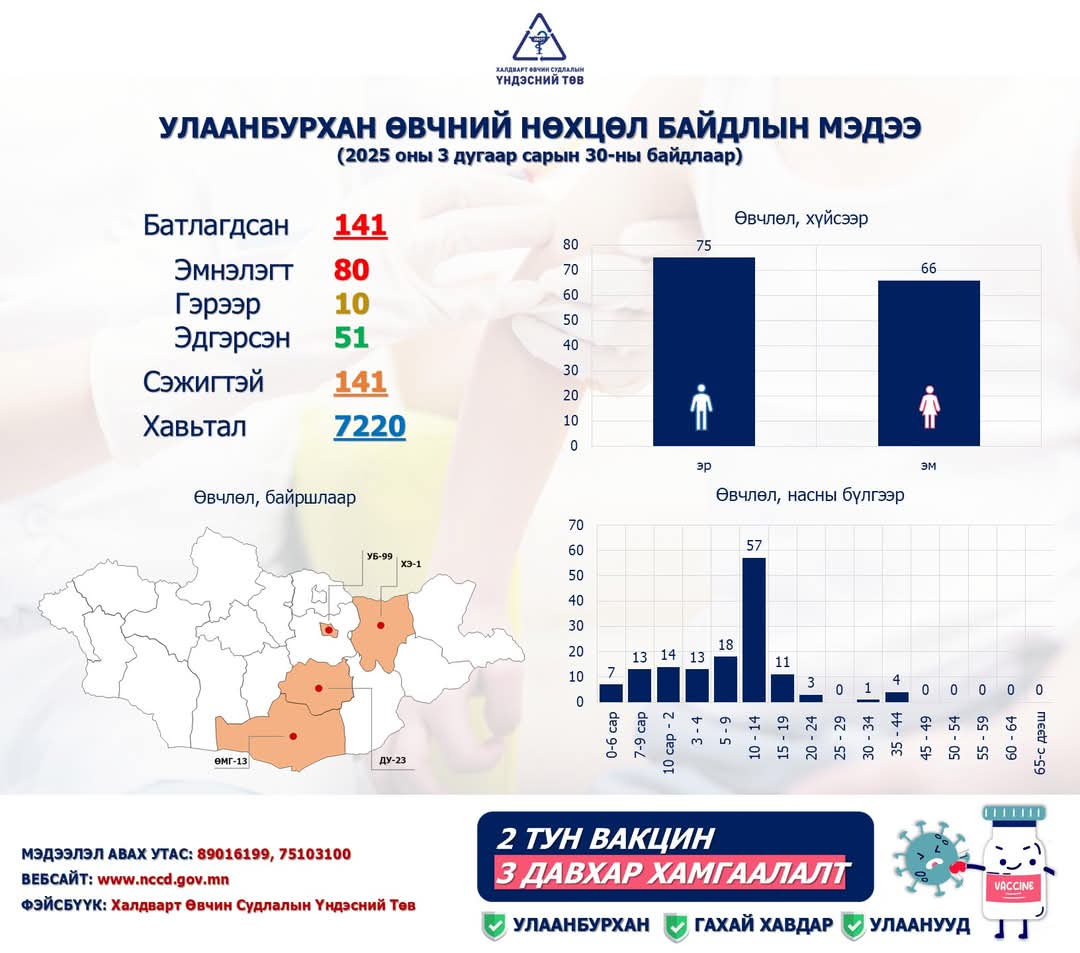 Эрүүл мэндийнхээ төлөө иргэн бүр хариуцлагатай байж, халдвараас сэргийлцгээе. Тодруулах, лавлах зүйл байвал ☎89016199, 75 103 100 утсанд хандана уу.