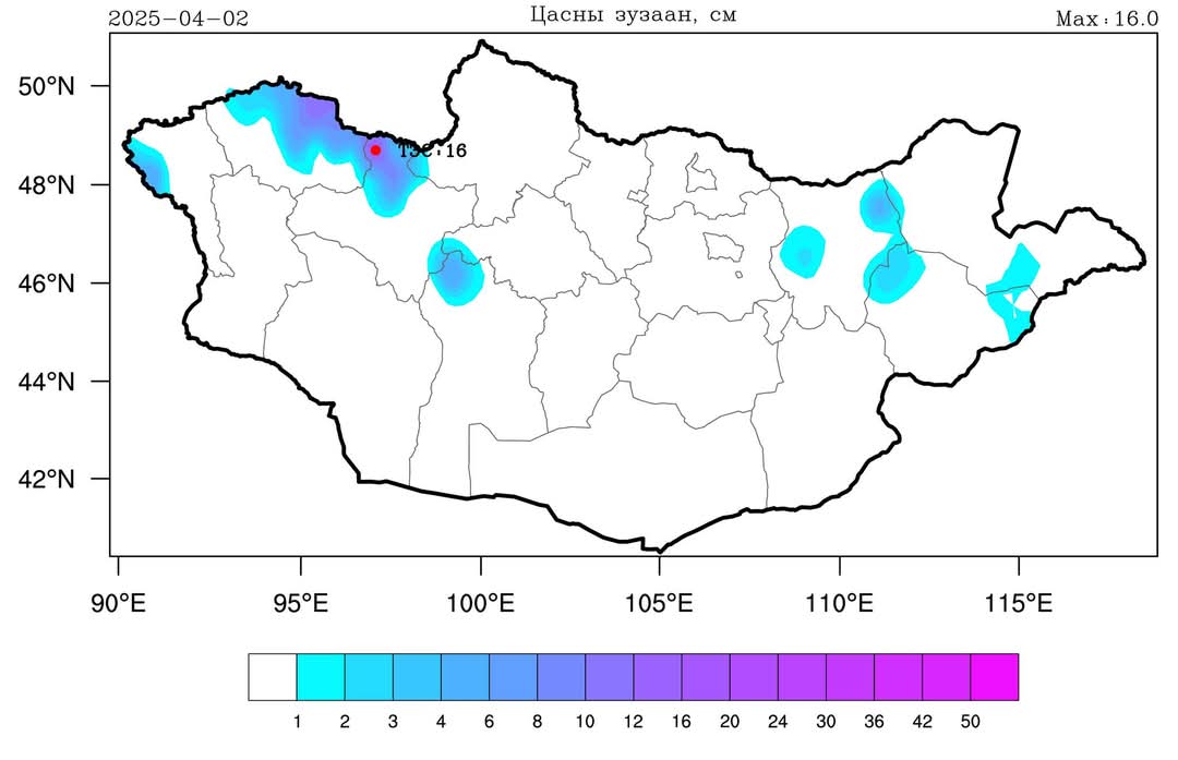 Цаг уурын станц, харуулын цасны зузааны мэдээгээр баруун аймгуудын нутгийн хойд хэсэг, зүүн аймгуудын нутгийн зарим газраар 0.1-16.0 см цасан бүрхүүл тогтсоноос хамгийн их нь Завханы Тэсэд 16.0 см, Баянхайрхан, Увсын Зүүнговь, Баруунтуруун, Завханы Түдэвтэйд 10.0-12.0 см, бусад нутгаар 1.0-8.0 см зузаан цасан бүрхүүлтэй байна.