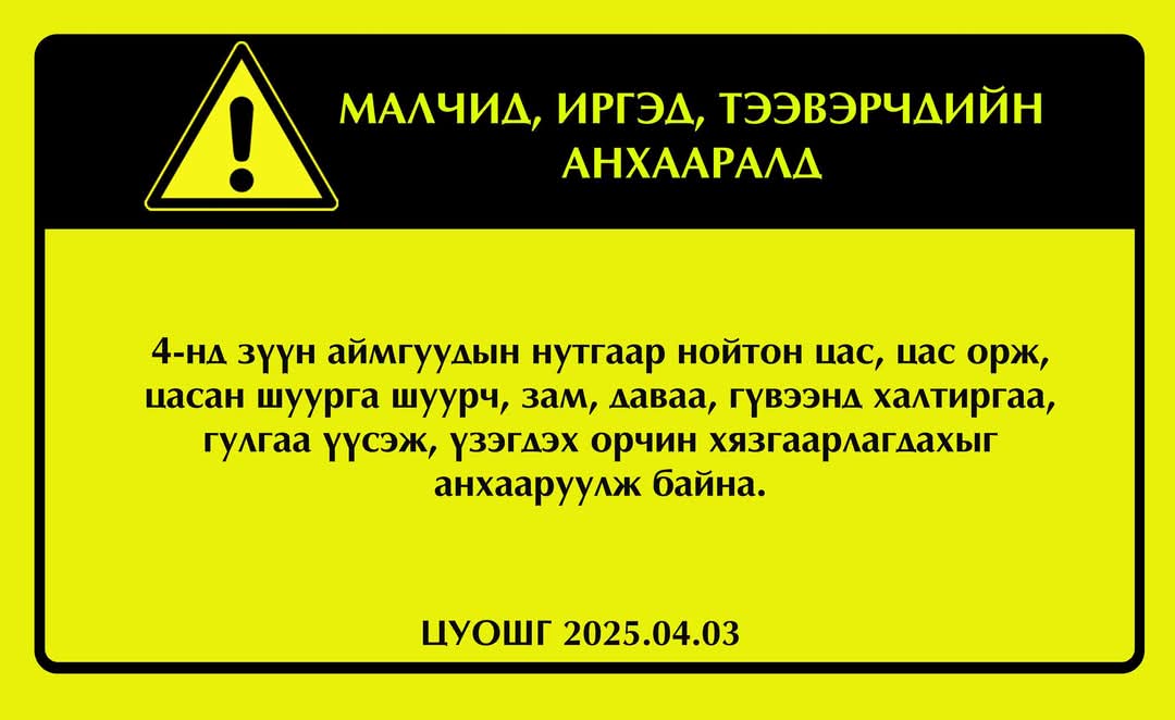 Энэ сарын 4-нд зүүн аймгуудын нутгаар нойтон цас, цас орж, цасан шуурга шуурч, зам, даваа, гүвээнд халтиргаа, гулгаа үүсэж, үзэгдэх орчин хязгаарлагдахыг анхааруулж байна.