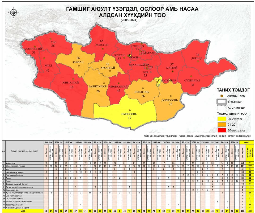 Сүүлийн 20 жилийн хугацаанд гамшиг, аюулт үзэгдэл, ослын улмаас 987 хүүхэд амь насаа алдаж, 422 хүүхэд түлэгдэж, бэртэж, өвчилсөн байна. Үүнээс 443 хүүхэд усны ослоор, 361 хүүхэд объектын гал түймэрт өртөж амь насаа алджээ. Тиймээс хүүхдэд тавих хараа хяналтаа сайжруулах, бага насны хүүхдийг харгалзах хүнгүй ганцааранг нь үлдээхүй байх, өрх, гэрийнхээ аюулгүй байдлыг хангахыг зөвлөж байна.