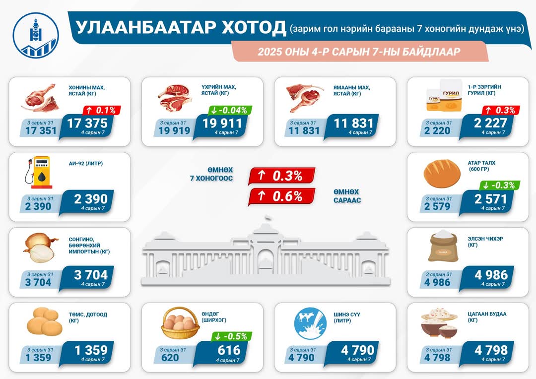 Товч мэдээ: Улаанбаатар хотод энэ сарын 7-ны байдлаар гол нэрийн зарим барааны үнэ өмнөх сараас 0.6 хувь, өмнөх 7 хоногоос 0.3 хувиар тус тус өссөн байна.