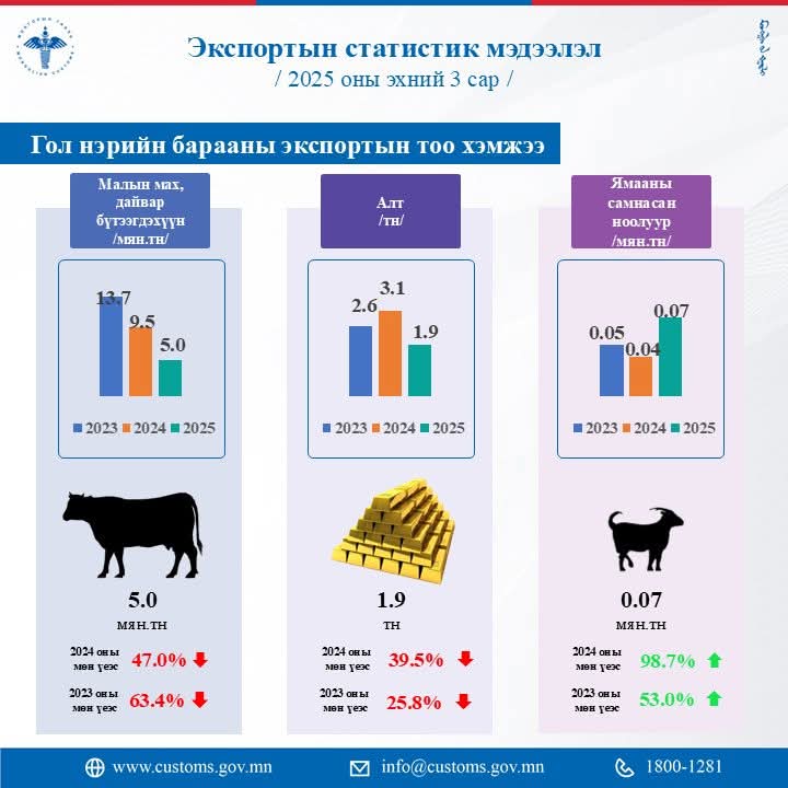 Гаалийн ерөнхий газар: 2025 оны эхний 3 сарын дүнгээр экспортод 3013.0 сая ам.долларын бараа, түүхий эд гаргасан нь өнгөрсөн оны мөн үетэй харьцуулахад 17.7 хувиар буурсан байна.