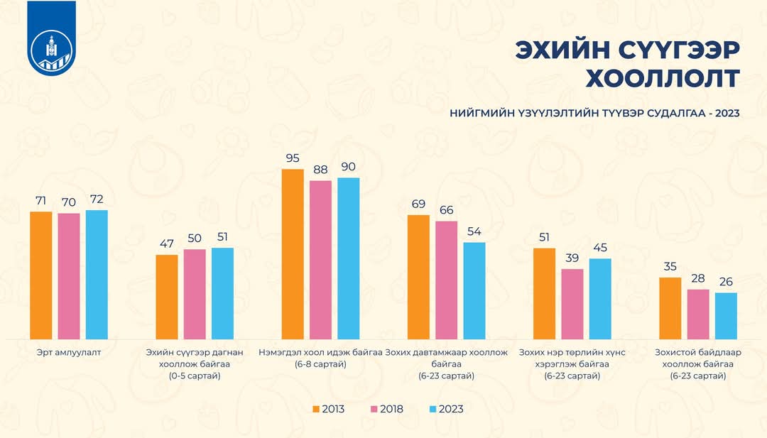 Энэ үзүүлэлт хот, хөдөөгийн хүүхдүүдийн хувьд ялгаатай байгаа юм. 2023 оны судалгааны үр дүнгээр энэ үзүүлэлтийн хувьд хотод хөдөөнөөс 9 нэгж хувиар бага байна. Мөн 0-5 сартай 2 хүүхэд тутмын 1 нь эхийн сүүгээр дагнан хооллож байна. Зохистой байдлаар хооллож байгаа 6-23 сартай хүүхдийн хувь өмнөх судалгаануудтай харьцуулахад буурчээ.