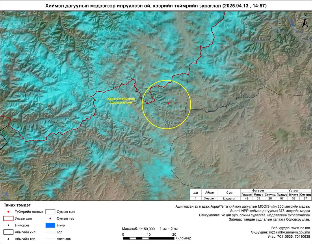 Он гарсаар улсын хэмжээнд өнөөдрийн байдлаар /2025.04.14/ Архангай, Дорнод, Сүхбаатар, Хэнтий, Дундговь, Төв, Сэлэнгэ, Булган, Хөвсгөл, Дархан-Уул аймгийн 36 суманд 51 удаагийн ой, хээрийн гал түймэр бүртгэгдээд байна. Хөвсгөл аймгийн Цагаан-Уул суманд өчигдөр /2025.04.13/ гарсан ой, хээрийн гал түймрийг унтраахаар аймгийн Онцгой байдлын газрын Цагаан-Уул сум дахь Гал түймэр унтраах, аврах 73 дугаар анги, Хилийн цэргийн 0257 дугаар ангийн алба хаагчид болон сумын мэргэжлийн ангийнхан ажиллаж байна.Ойрын өдрүүдэд ихэнх нутгаар дулаарах тул ой, хээрийн түймрээс урьдчилан сэргийлж, галын аюулгүй байдлыг сайтар хангахыг онцгойлон анхааруулж байна.