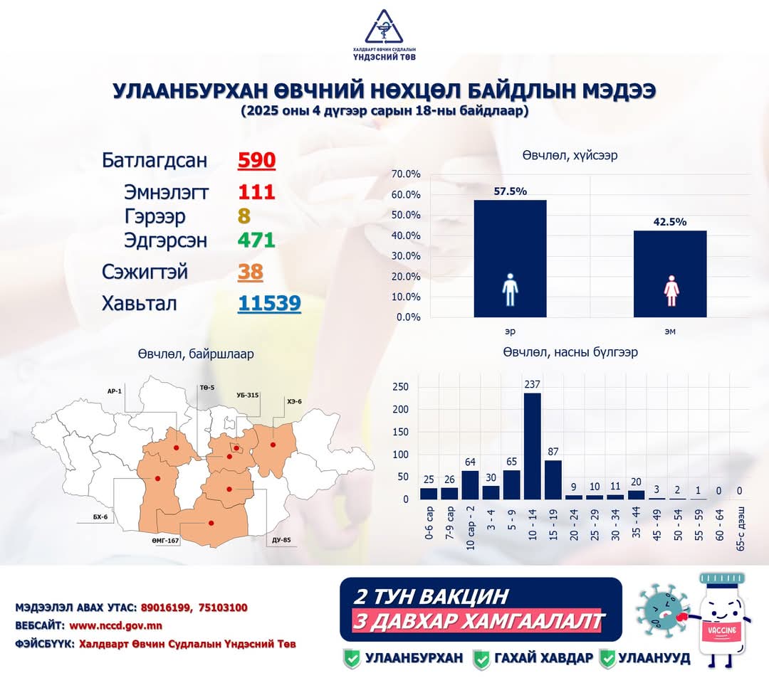 Эрүүл мэндийнхээ төлөө иргэн бүр хариуцлагатай байж, халдвараас сэргийлцгээе. Тодруулах, лавлах зүйл байвал ☎89016199, 75 103 100 утсанд хандана уу.