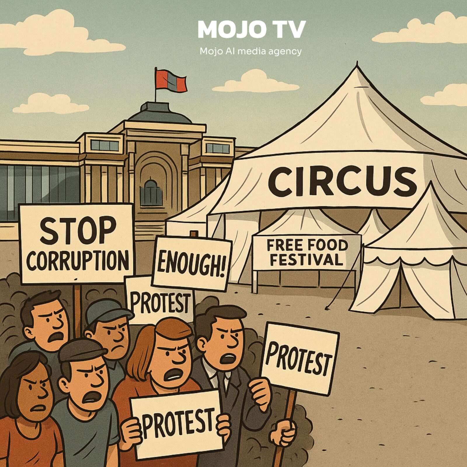 Эрх баригчид ард түмнийг төв талбайд жагсчих вий гэсэндээ уг талбайд том асар барьж, food festival зохион байгуулж, будаатай хуургаар хүмүүсийг хооллосон. Үүний араас циркийн үнэгүй тоглолт хийж байна. Өчигдрөөс талбайн ар хэсгээр нэмж жижиг асар майхан босгож, жагсагчдад, үзэл бодлоо илэрхийлэх гэсэн иргэдэд зай талбай үлдээсэнгүй. Ард түмэн, иргэдийн нэгдэж цугладаг талбайг “үнэгүй хоол”, “үнэгүй цирк” нэрийн дор булааж байгааг энэ шог зургаас харж болно.