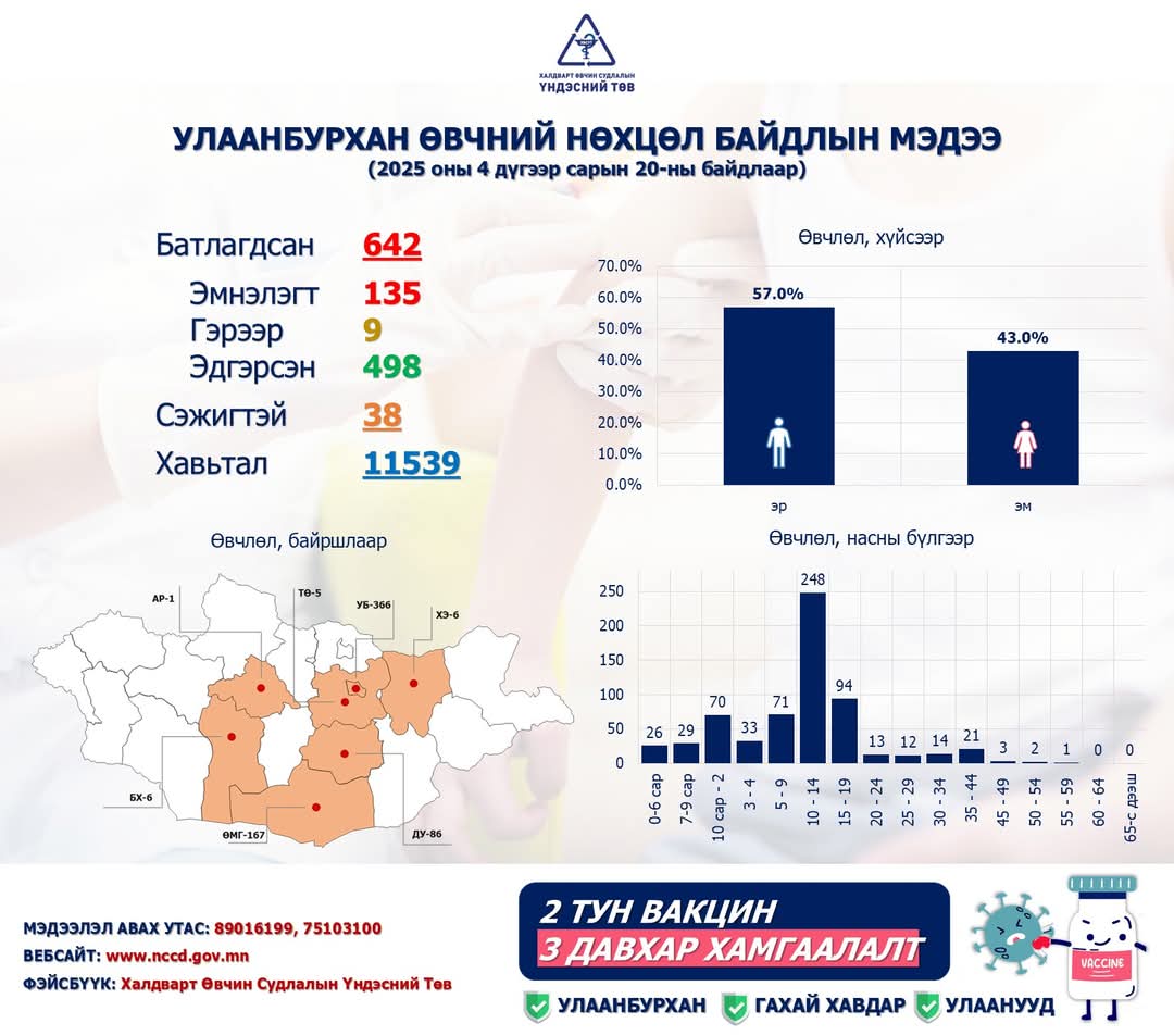 Эрүүл мэндийнхээ төлөө иргэн бүр хариуцлагатай байж, халдвараас сэргийлцгээе. Тодруулах, лавлах зүйл байвал ☎89016199, 75 103 100 утсанд хандана уу.
