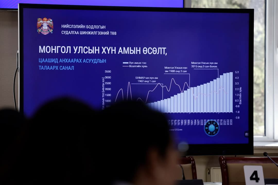 УИХ-ын гишүүн, ажлын хэсгийн ахлагч Д.Үүрийнтуяа, монгол хүний амьдралын чанар түүний орчин нөхцөлтэй холбоотой судалгааны дүн, дүгнэлтээ танилцуулахаар ирсэн, их дээд сургууль шинжлэх ухааны байгууллагын эрдэмтэд судлаачдад талархал илэрхийлсэн.Нийслэлийн Бодлогын судалгаа, шинжилгээний төвийн Нийгэм, эдийн засгийн судалгааны газрын захирал А.Амарбал Монгол Улсын хүн амын өсөлт, цаашид анхаарах асуудлын талаарх судалгаагаа танилцуулсан. Тэрбээр, манай улсад 3-4 хүүхэдтэй айл олон хүүхэдтэй өрхөд тооцогдож байна. Тодруулбал, гурваас дээш хүүхэдтэй 167.000 өрх байна. Хүн амаа нэмэгдүүлэх төрийн бодлого хэрэгжүүлэхгүй бол 2036 он орчимд 4 сая дэх иргэнээ хүлээж авах нөхцөлд хүрээд байна гээд хүн ам, хөгжлийн бодлогоо шинэчлэх, нөхөн үржихүйн эрүүл мэндийг дэмжих бодлого хэрэгжүүлэх, олон хүүхэдтэй гэр бүлийн амьжиргааг дэмжих, цэцэрлэг, сургуулийн хүртээмжийг нэмэгдүүлэх, зардлыг бууруулах замаар хүн амаа өсгөх зэрэг шийдлүүдийг санал болгосон юм.