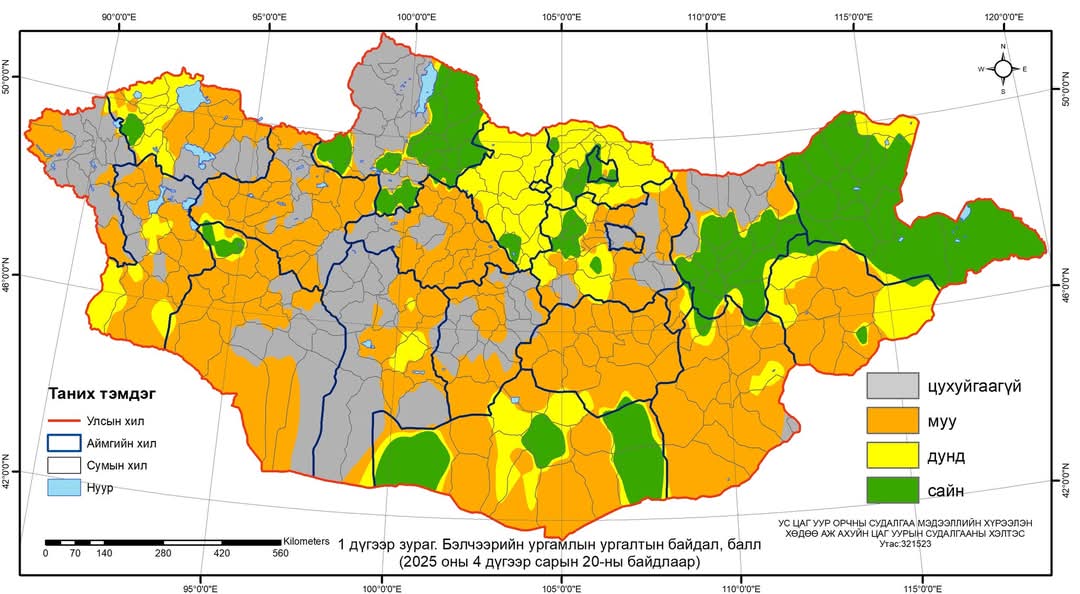 Бэлчээрийн ургамлын ургалтын байдал 4 дүгээр сарын 20-ны байдлаар нийт нутгийн 30 орчим хувьд цухуйгаагүй байна. Харин Ховд, Говь-Алтай, Завхан, Архангай, Говьсүмбэр, Дундговь, Өмнөговь, Дорноговь, Сүхбаатарын ихэнх, Баян-Өлгий, Увс, Баянхонгор, Өвөрхангай, Төвийн зарим сумдын нутгаар муу, Орхоны нийт, Булган, Сэлэнгийн ихэнх, Увс, Ховд, Баянхонгор, Төв, Өмнөговь, Сүхбаатар, Дорнодын цөөн сумдын нутгаар дунд, Дархан-Уул, Дорнодын ихэнх, Хөвсгөл, Хэнтийн зарим, Увс, Говь-Алтай, Булган, Сэлэнгэ, Төв, Өмнөговийн ганц нэг сумдын нутгаар хэвийн байна.