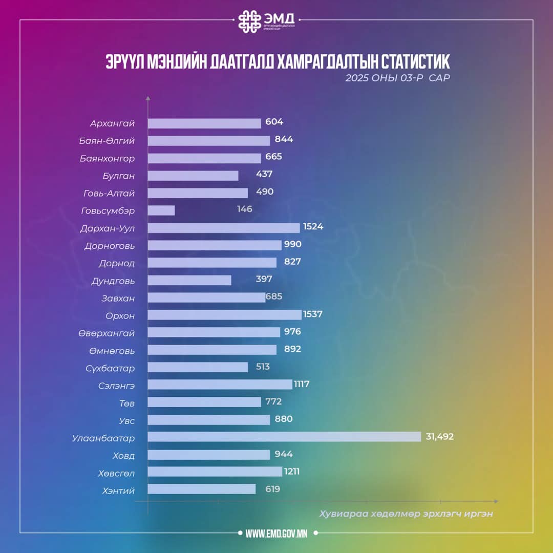 ЭМД-ын орлого, хамрагдалтын статистик мэдээллийг танилцуулж байна. Монгол Улсын хэмжээнд 2025 онд ЭМД-аа өөрөө хариуцан төлөх 274,110 хувиараа хөдөлмөр эрхлэгч иргэн байгаа бөгөөд оны эхний 3 сарын байдлаар дээрх иргэдийн 17.7 хувийг ЭМД-д бүрэн хамруулаад байна.