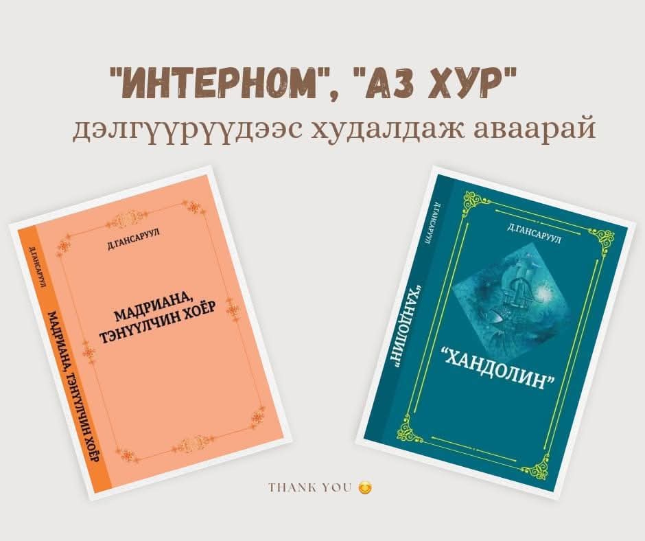 Энэ урамшууллын үеэр уншигч та бүхэн сэтгүүлч, зохиолч Д.Гансаруулын триллер, детектив, адал явдалт туужуудын “Хандолин”, “Мадриана, тэнүүлчин хоёр” хос ном номыг худалдан аваарай.