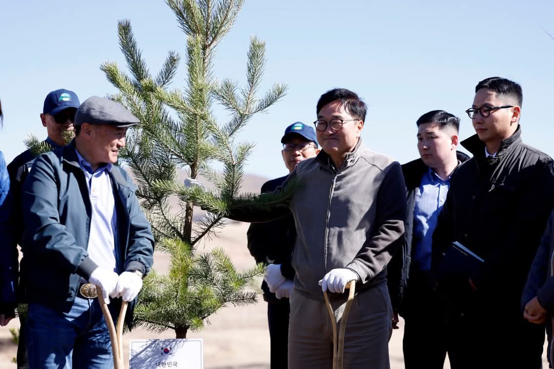 Тэрбээр айлчлалын хүрээнд Монгол-Солонгосын хамтарсан “Ногоон хэрэм” төслийн хүрээнд Горхи-Тэрэлжийн байгалийн цогцолбор газарт байгуулсан “Хамтын ойн төгөл”-д мод тарив.