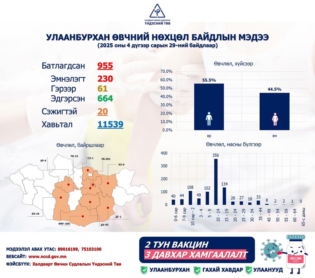 Эрүүл мэндийнхээ төлөө иргэн бүр хариуцлагатай байж, халдвараас сэргийлцгээе. Тодруулах, лавлах зүйл байвал ☎89016199, 75 103 100 утсанд хандана уу.