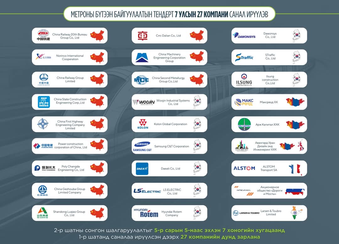 Улаанбаатар хот 2025-2028 онд 24 мега төсөл хэрэгжүүлнэ. Үүний нэг нь “Улаанбаатар метро” төсөл юм. Улаанбаатар хотод их багтаамжийн нийтийн тээврийн хэрэгсэл метро барих төслийн барилга угсралтын гүйцэтгэгчийг сонгон шалгаруулах I шатны тендерийг өнгөрсөн оны 10 дугаар сард зарласан. Тэгвэл I шатны тендерийг энэ сарын 28-ны өдөр нээлээ. Уг тендерт 7 улсын 27 ААН материалаа ирүүлсэн байна. Тодруулбал, Монгол, Солонгос, Англи, ОХУ, Франц, Энэтхэг, Хятад улсын компаниуд материалаа ирүүлжээ.