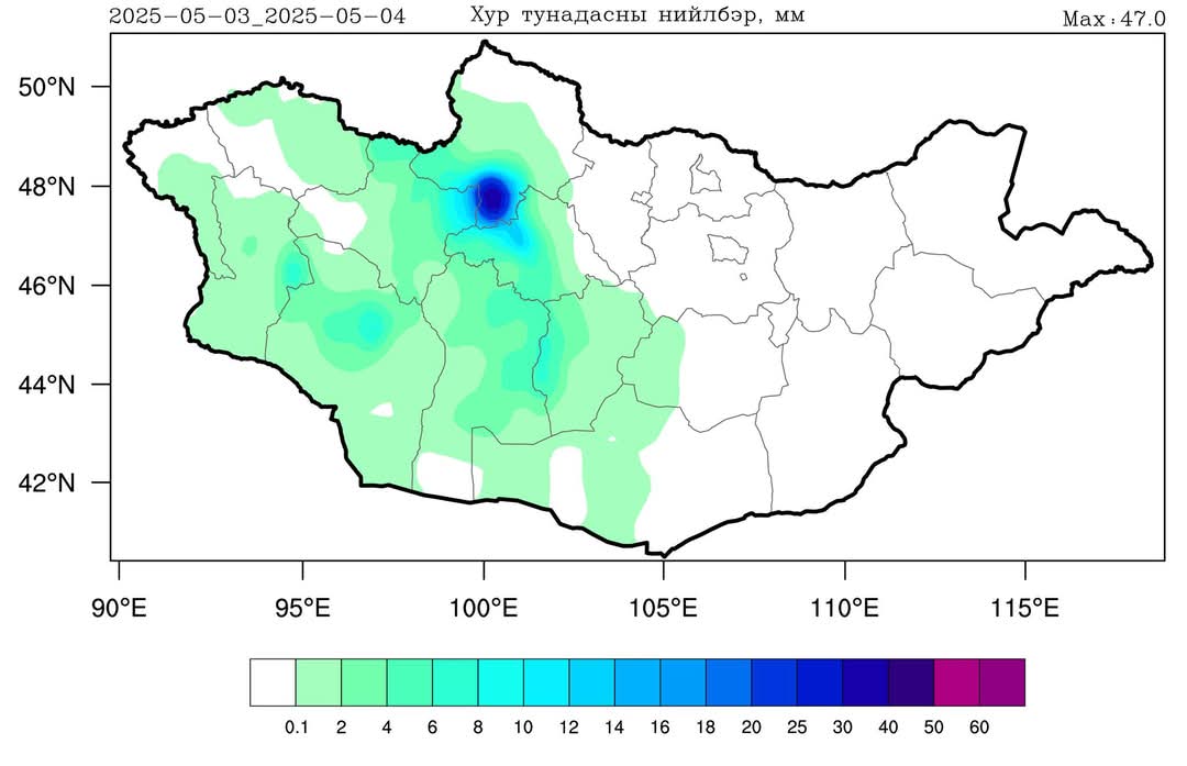 Өнгөрсөн хоногт нутгийн баруун хагаст 0.0-47.0 мм бороо, нойтон цас орсон байна. Үүнээс хамгийн их нь Хөвсгөлийн Шинэ-Идэрт 47 мм, Жаргалантад 22.0 мм, Төмөрбулагт 15.0 мм, Архангайн Өндөр-Улаанд 17 мм, Тариатад 9.0 мм, Завханы Тосонцэнгэлд 10.0 мм, бусад хэсгээр 0.0-7.0 мм орсон байна.