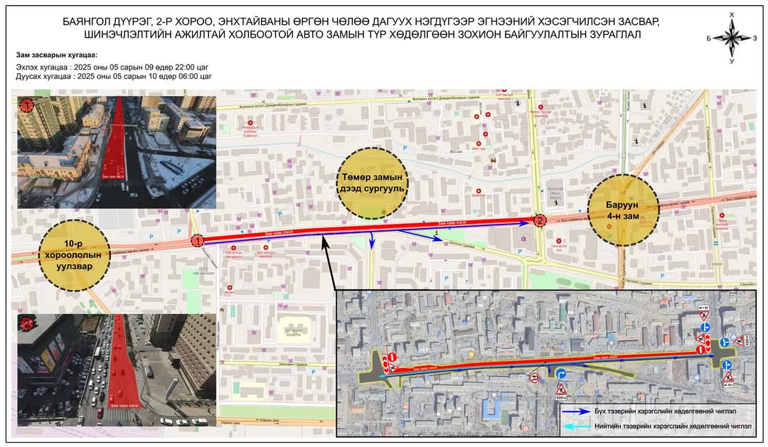 БГД-ийн 2 дугаар хороо, Энхтайваны өргөн чөлөөний авто зам шинэчлэлтийн ажлын хүрээнд 25 дугаар эмийн сангийн уулзвараас “Гранд плаза”-ийн уулзвар хүртэлх авто замын хойд хэсгийг 5 дугаар сарын 9-ний 22:00 цагаас 10-ны өдрийн 06:00 цагийн хооронд хааж, шинэчилнэ.