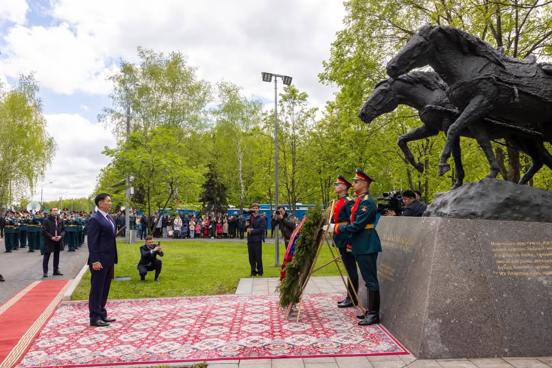 Ерөнхийлөгч У.Хүрэлсүх ОХУ-ын нийслэл Москва хотын Хүндэтгэлийн дэнж дэх “Ялалтын цэцэрлэгт хүрээлэн”-д Монголын ард түмнээс бэлэг болгосон “Ялалтад тэмүүлсэн морьд” хөшөөнд хүндэтгэл үзүүллээ.