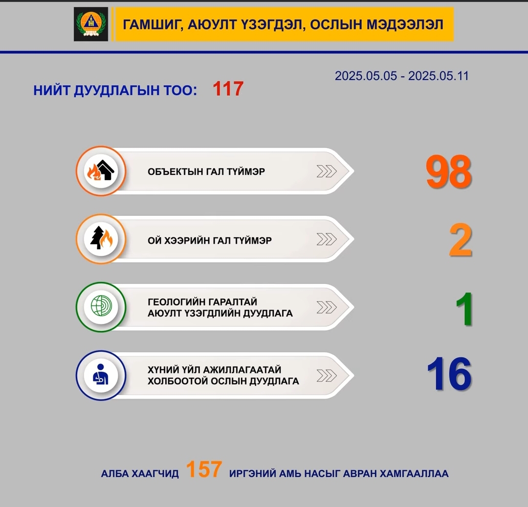 Улсын хэмжээнд өнгөрсөн долоо хоногт /2025.05.05-05.11/ нийслэлийн 7 дүүрэг, 18 аймгийн 40 суманд аюулт үзэгдэл, ослын 117 удаагийн дуудлага бүртгэгдсэн байна.Дуудлагын дагуу төв, орон нутгийн Онцгой байдлын байгууллагын алба хаагчид үүрэг гүйцэтгэж, 157 иргэний амь насыг авран хамгааллаа.