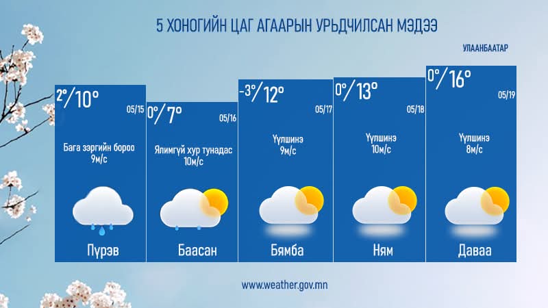 5-р сарын 15-16-нд Хангайн уулархаг нутгаар нойтон цас орж, нутгийн зарим газраар хүчтэй салхи, шороон шуургатай байх тул хуурайшилт нэмэгдэхийг анхааруулж байна.