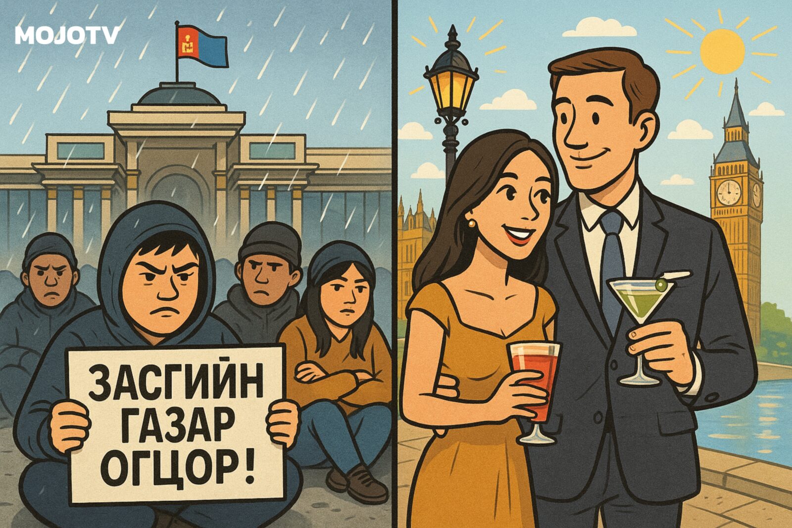 Гэвч яг энэ үед тэдний татварын мөнгөөр тансаглаж буй нэгэн эрх мэдэлтний хүүхдүүд Лондонгийн тансаг ресторанаар зугаалж, коктейль барин нарны гэрэлд инээмсэглэнэ. Энэ бол зөвхөн ялгаа биш шударга бусын тод хөрөг юм.