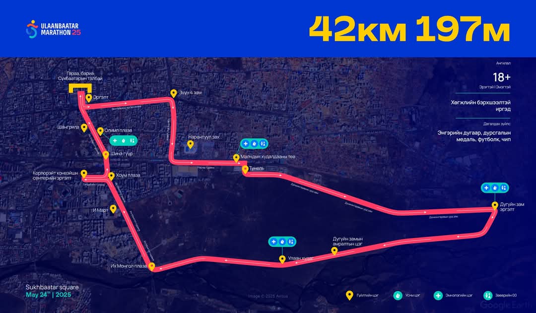 Энэ жил “Улаанбаатар марафон” олон улсын гүйлтэд гадаад, дотоодын нийт 30.000 орчим иргэн бүртгүүлжээ. Тэднээс 18.000 нь эрүүл мэндийн буюу 5 км-т гүйхээр бүртгүүлсэн бол гэр бүлийн гүйлтэд нийт 4000 гаруй хүн гүйхээр бүртгүүлжээ. “Улаанбаатар марафон 2025” олон улсын гүйлтийн нээлтийн ажиллагаа маргааш буюу 5 дугаар сарын 24-ний 09:30 цагт Соёлын төв өргөөний урд болно. Марафон гүйлтэд оролцох тамирчдыг төрөл тус бүрээр нэг шугамд оруулж, гүйхийн өмнө нэгдсэн дасгал хийснээр гараанаас гарах тул гүйгчдийг цагаасаа эрт цуглахыг уриалж байна. 5 км, 10 км, 21 км, 42 км-ийн зайд гүйгчид 10:00 цагт Соёлын төв өргөөний урд талбайгаас гараанаас зэрэг гарах юм. Энэ жил 5 км-т гүйгчид нар буруу гүйж бариандаа орох бол хагас болон бүтэн марафонд гүйгчид шинэ маршрутаар гүйнэ.