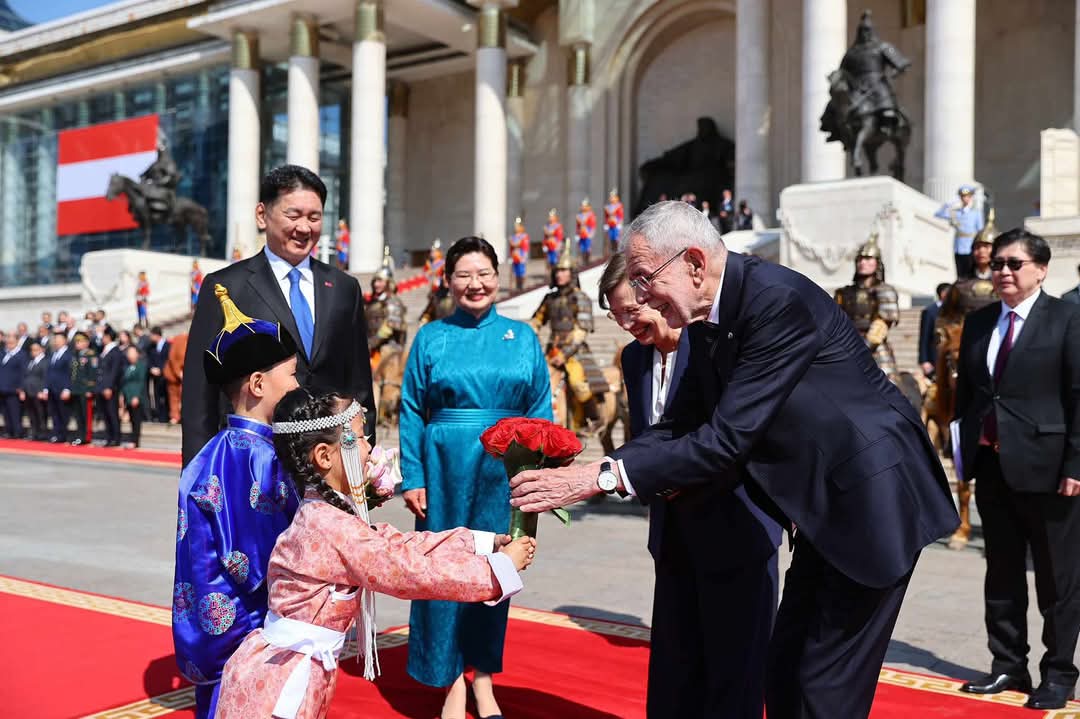 Монгол Улсын Ерөнхийлөгч Ухнаагийн Хүрэлсүх, гэргий Лувсандоржийн Болорцэцэгийн хамт Бүгд Найрамдах Австри Улсын Ерөнхийлөгч Александр Ван дер Беллен, гэргий Дорис Шмидауэр нарыг Д.Сүхбаатарын талбайд угтаж авлаа.Төрийн хүндэт харуулын захирагч айлтгал өргөсний дараа хөгжимд хоёр улсын Төрийн дуулал эгшиглэв. Ерөнхийлөгч нар Төрийн ёслолын цэргийн цагаан туганд мэхийн ёсолж, Ерөнхийлөгч Александр Ван дер Беллен Төрийн хүндэт харуулын цэргүүдтэй мэндчиллээ.