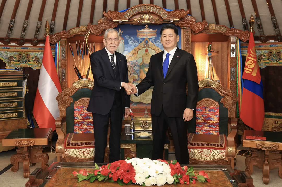 Монгол Улсын Ерөнхийлөгч Ухнаагийн Хүрэлсүх, Бүгд Найрамдах Австри Улсын Ерөнхийлөгч Александр Ван дер Беллен нар Төрийн ордонд албан ёсны хэлэлцээ хийлээ.Төрийн тэргүүн нар ардчилал, хүний эрх, хууль дээдлэх зарчим зэрэг нийтлэг үнэт зүйлд суурилсан уламжлалт найрсаг харилцааны ололт, амжилтыг бататгаж, харилцаа, хамтын ажиллагаа улс төр, эдийн засаг, худалдаа, хөрөнгө оруулалт, боловсрол, шинжлэх ухаан, нийгмийн хамгаалал зэрэг салбарт өргөжиж байгаад сэтгэл хангалуун байгаагаа илэрхийллээ.