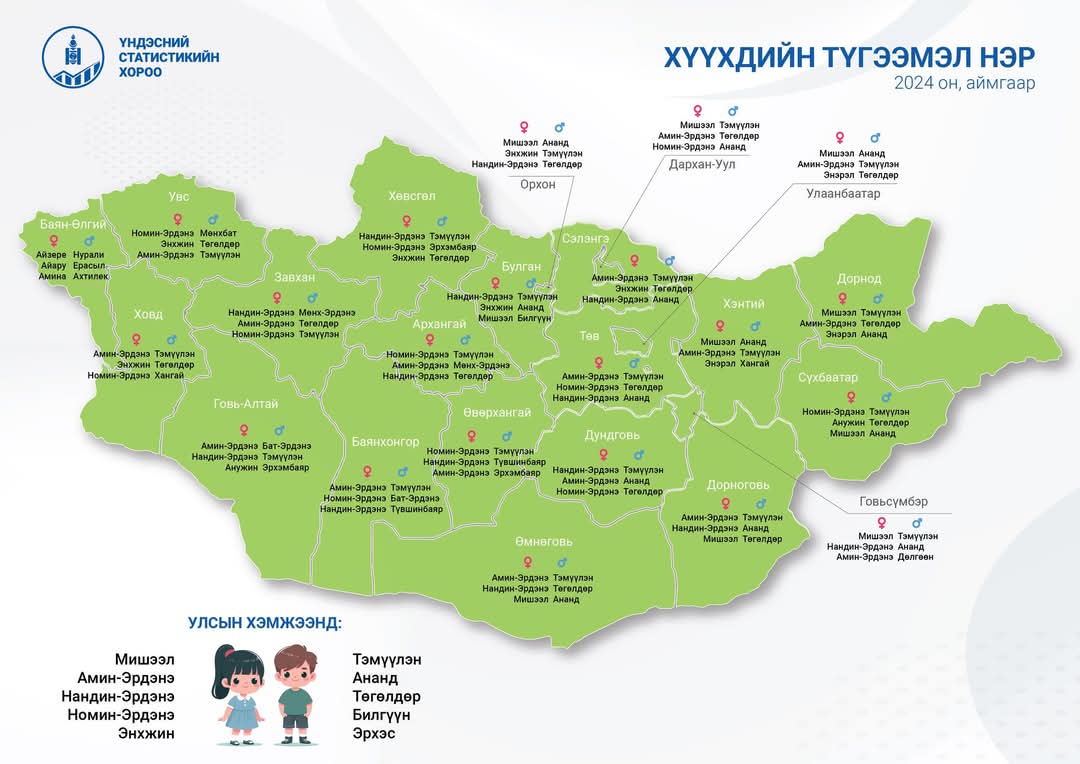 Хүүхдүүдийн хамгийн түгээмэл нэрсийг танилцуулж байна. Улсын хэмжээнд эмэгтэй хүүхдүүдээс Мишээл, Амин-Эрдэнэ, Нандин-Эрдэнэ, Номин-Эрдэнэ, Энхжин харин эрэгтэй хүүхдүүдээс Тэмүүлэн, Ананд, Төгөлдөр, Билгүүн, Эрхэс нэртэй хүүхдүүд хамгийн олон байна.