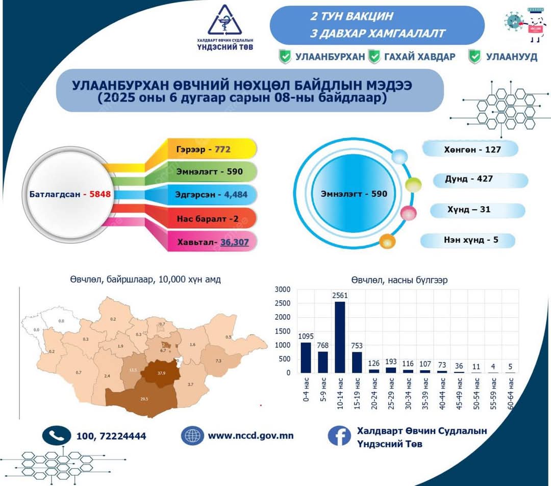 Эрүүл мэндийнхээ төлөө иргэн бүр хариуцлагатай байж, халдвараас сэргийлцгээе. Тодруулах, лавлах зүйл байвал ☎️72224444, 100 утсанд хандана уу.