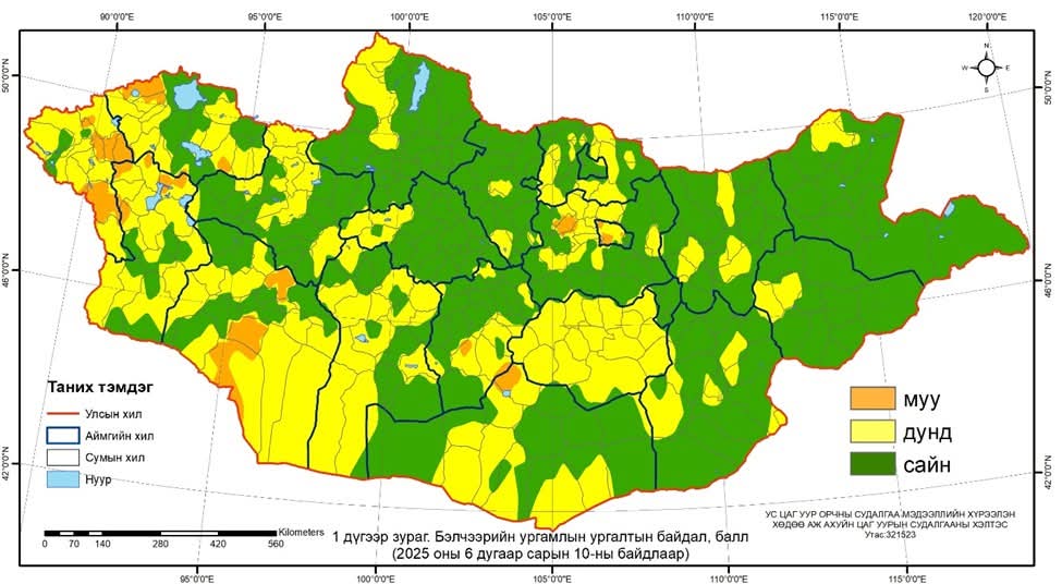 Бэлчээрийн ургамлын ургалтын байдал зургадугаар сарын 10-ны байдлаар Баян-Өлгий, Говь-Алтай, Увс, Ховд, Өвөрхангай, Өмнөговь, Төвийн цөөн сумдын нутгаар муу. Говьсүмбэрийн нийт, Хөвсгөл, Булган, Архангай, Дархан-Уул, Хэнтий, Дорноговь, Дорнод, Сүхбаатарын ихэнх, Увс, Завхан, Өвөрхангай, Сэлэнгэ, Төв, Өмнөговийн зарим, Баян-Өлгий, Ховд, Говь-Алтай, Баянхонгорын цөөн сумдын нутгаар хэвийн, бусад нутгаар дунд байна.