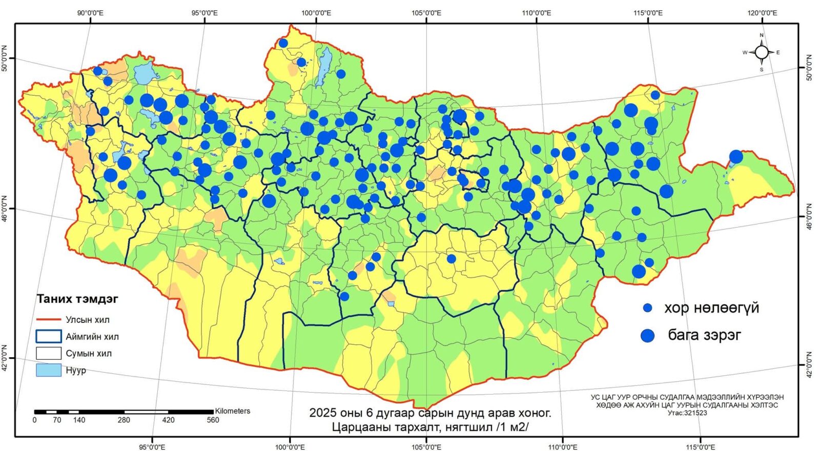 Царцааны тархалт, нягтшилын 1х1 метр талбайн 2025 оны 6 дугаар сарын 20-ны мэдээгээр ихэнх нутгаар сибирийн царцаа, бараан далавчит царцаахай ажиглагдсан ба Увсын Малчин, Ховдын Чандмань, Баянхонгорын Гурванбулаг суманд царцааны хэт олшролттой байна.