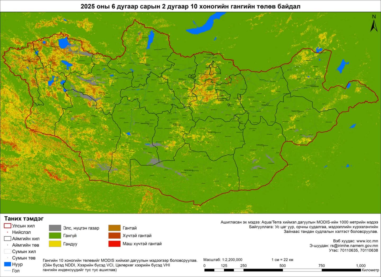 2025 оны 6-р сарын 2-р 10 хоногийн гангийн зураглал дээр Монгол орны хэмжээнд нийт нутаг дэвсгэрийн 0.2% нь маш хүчтэй гантай, 0.9% нь хүчтэй гантай, 4.2% нь гантай, 11.3% нь гандуу, 83.3% нь гангүй байна.