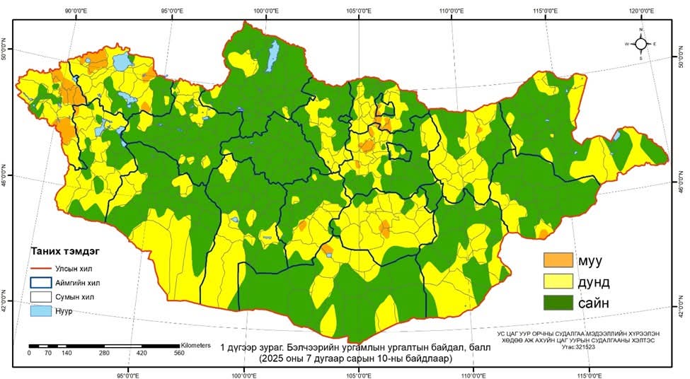 Бэлчээрийн ургамлын ургалтын байдал 7 дугаар сарын 10-ны байдлаар нийт нутгийн 58 хувьд гантай болон гандуу, 42 хувьд хэвийн байна.