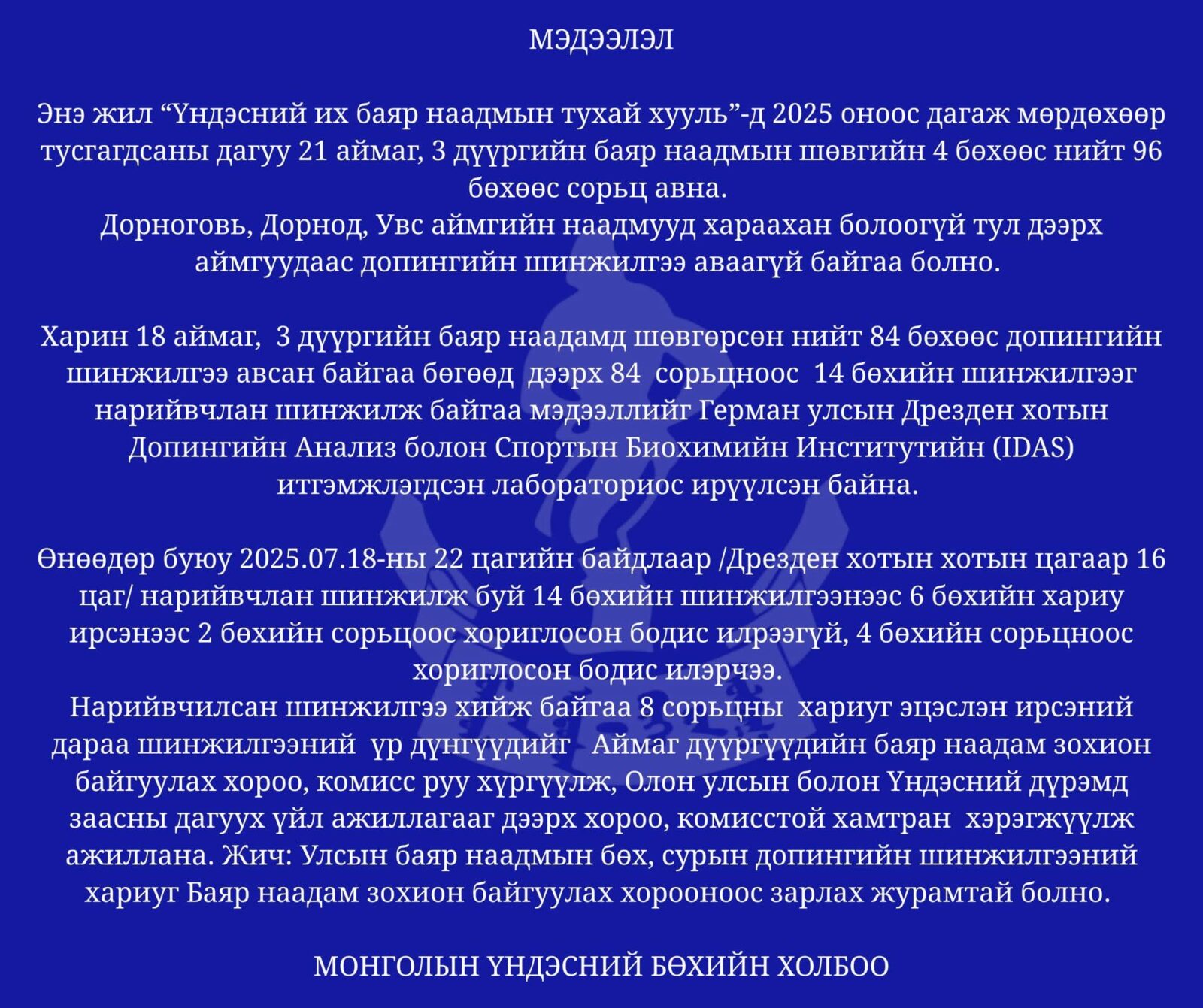 Өнөөдөр буюу 2025.07.18-ны 22 цагийн байдлаар /Дрезден хотын хотын цагаар 16цаг/нарийвчлан шинжилж буй 14 бөхийн шинжилгээнээс 6 бөхийн хариу ирснээс 2 бөхийн сорьцоос хориглосон бодис илрээгүй, 4 бөхийн сорьцноос хориглосон бодис илэрчээ. Нарийвчилсан шинжилгээ хийж байгаа 8 сорьцны хариуг эцэслэн ирсэний дараа шинжилгээний үр дүнгүүдийг Аймаг дүүргүүдийн баяр наадам зохион байгуулах хороо, комисс руу хүргүүлж, Олон улсын болон Үндэсний дүрэмд заасны дагуух үйл ажиллагааг дээрх хороо, комисстой хамтран хэрэгжүүлжажиллана.