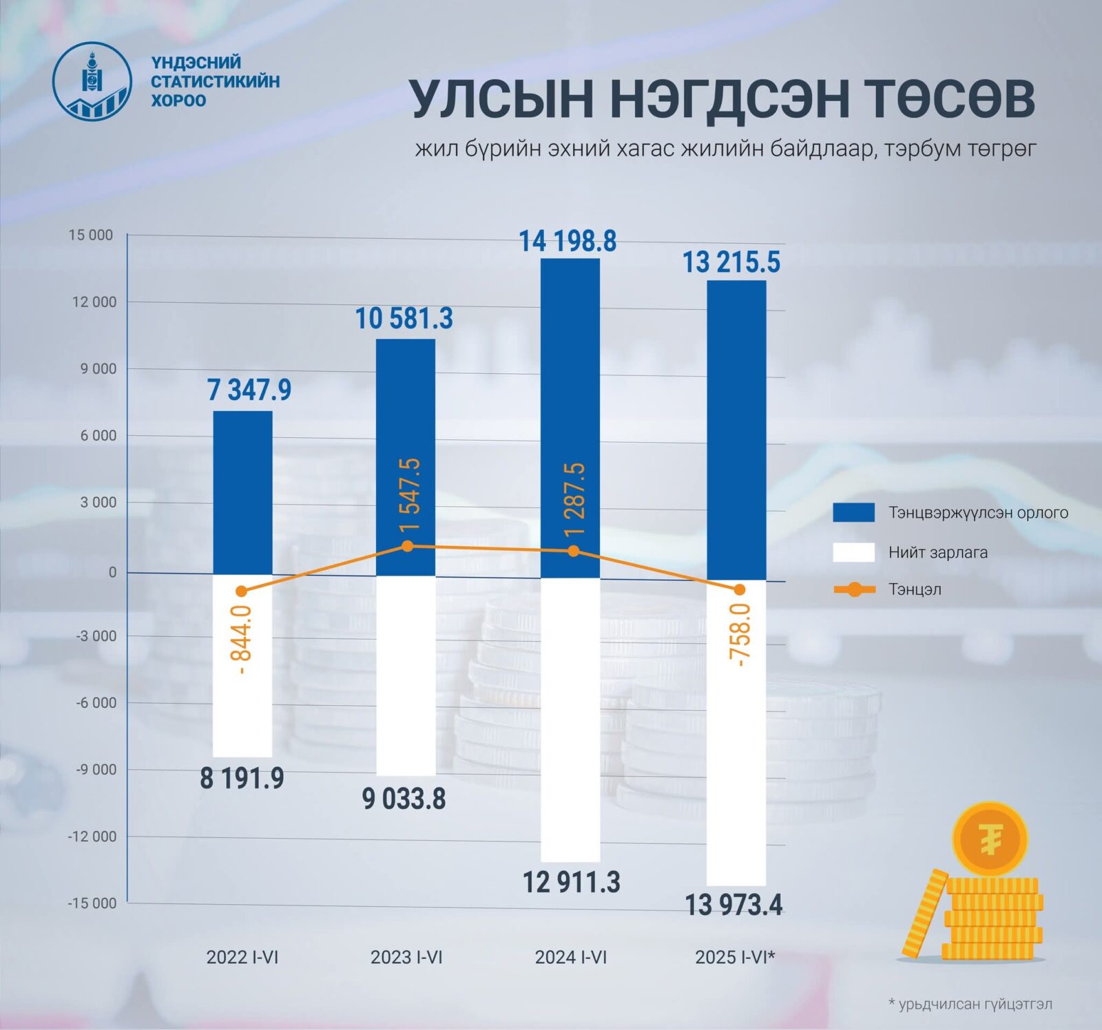 Улсын нэгдсэн төсвийн нийт орлого, тусламжийн хэмжээ 2025 оны эхний хагас жилийн урьдчилсан гүйцэтгэлээр 14.0 их наяд төгрөг болж, өмнөх оны мөн үеэс 914.4 (6.1%) тэрбум төгрөг, тэнцвэржүүлсэн орлого тусламжийн хэмжээ 13.2 их наяд төгрөг болж, өмнөх оны мөн үеэс 983.3 (6.9%) их наяд төгрөгөөр тус тус буурсан байна.