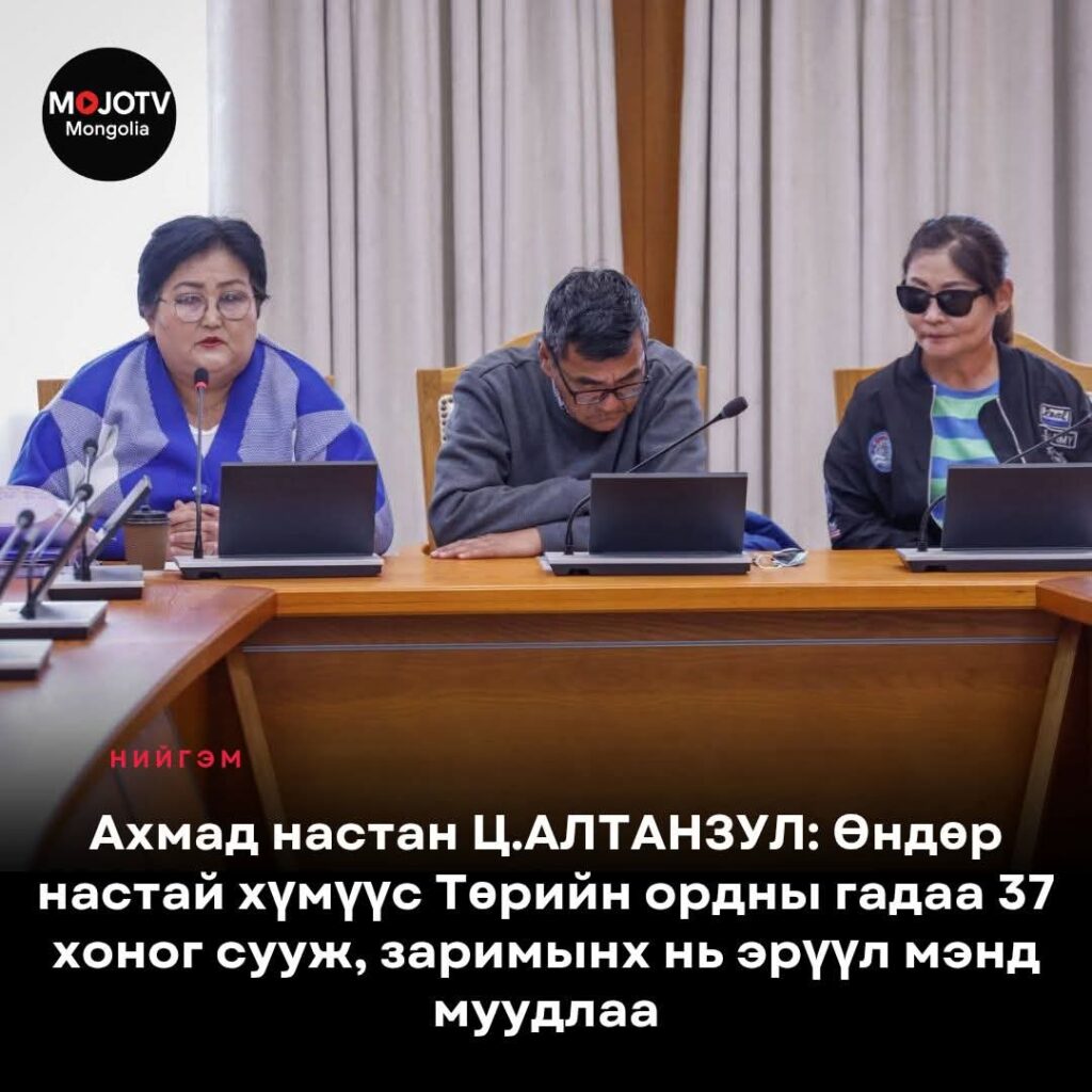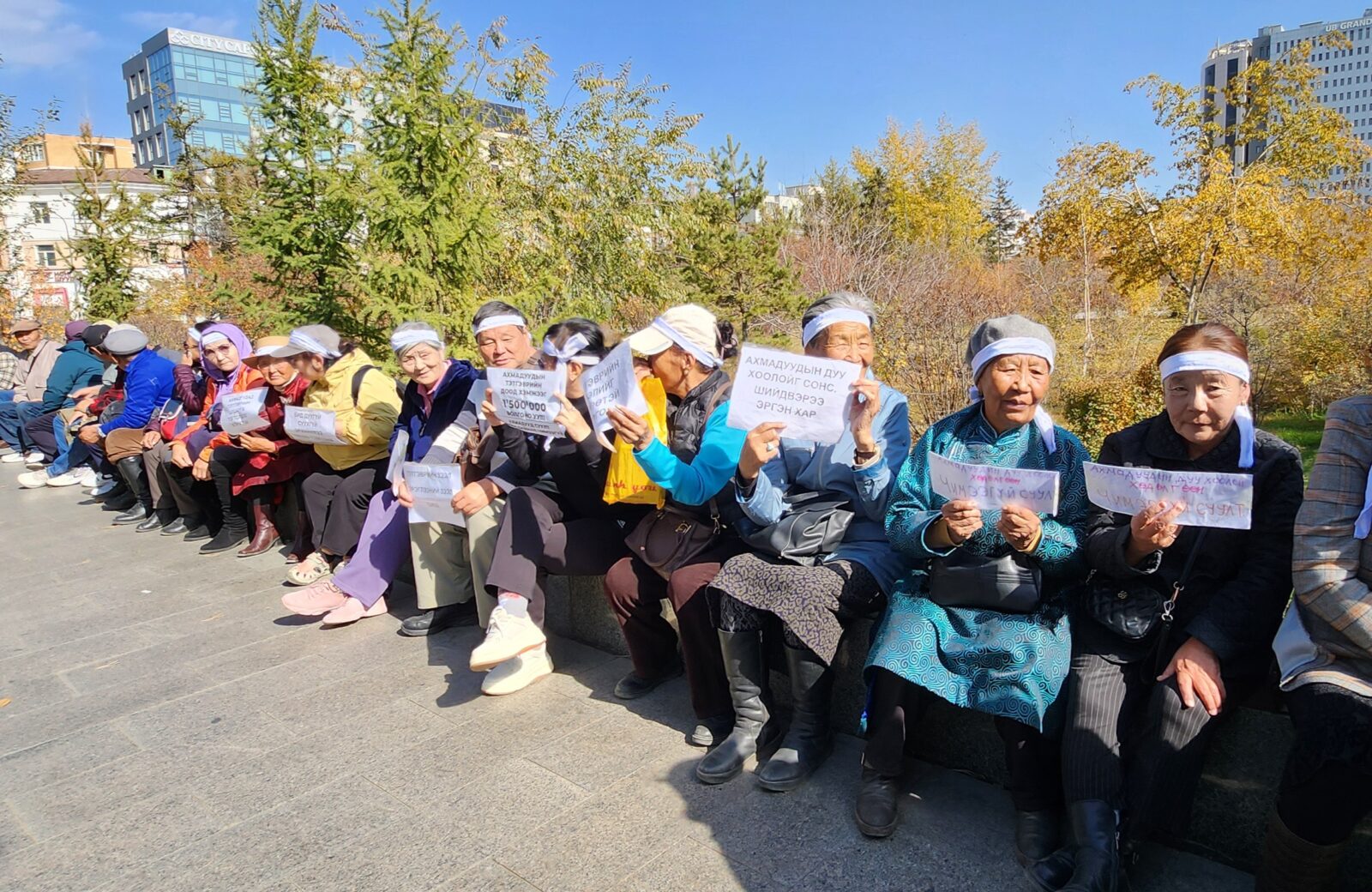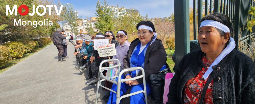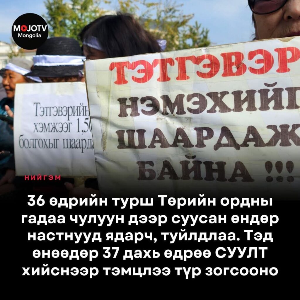 АЗИЙН ХҮНИЙ ЭРХИЙН ШАГНАЛТ СЭТГҮҮЛЧ Д.ГАНСАРУУЛ: Ахмадууд тэтгэврийн доод хэмжээг 1.500.000 төгрөг болгохыг шаардаж зургадугаар сараас аравдугаар сарын 2-ны өдрийг хүртэл Төрийн ордны баруун хаалганы гадна, хуучин хашааны суурин дээрх цардмал дээр өглөө 11:00 цагаас 17:30 цаг хүртэл 37 өдрийн турш суулаа. Тэмцлийн олон хэлбэр байдгийн нэг нь ЧИМЭЭГҮЙ СУУЛТ. Тэд энэ удаад уг хувилбарыг сонгож 37 өдөр Төрийн ордны үүдийг нар, бороо, салхи, жаврыг эс тоон сахив.