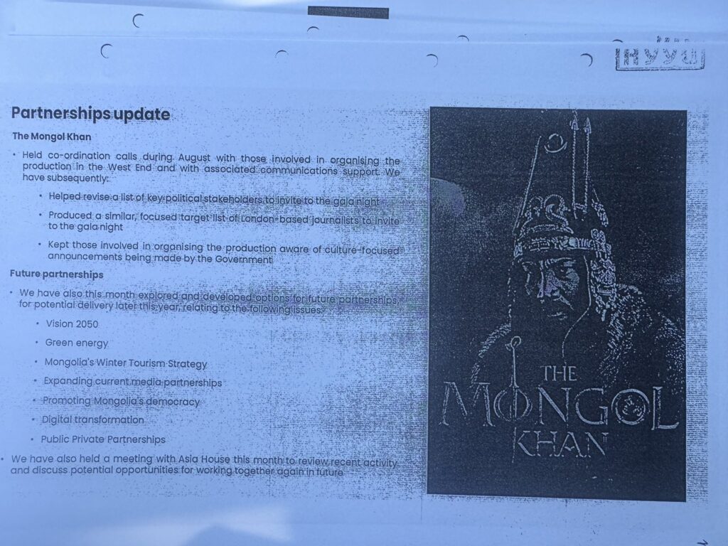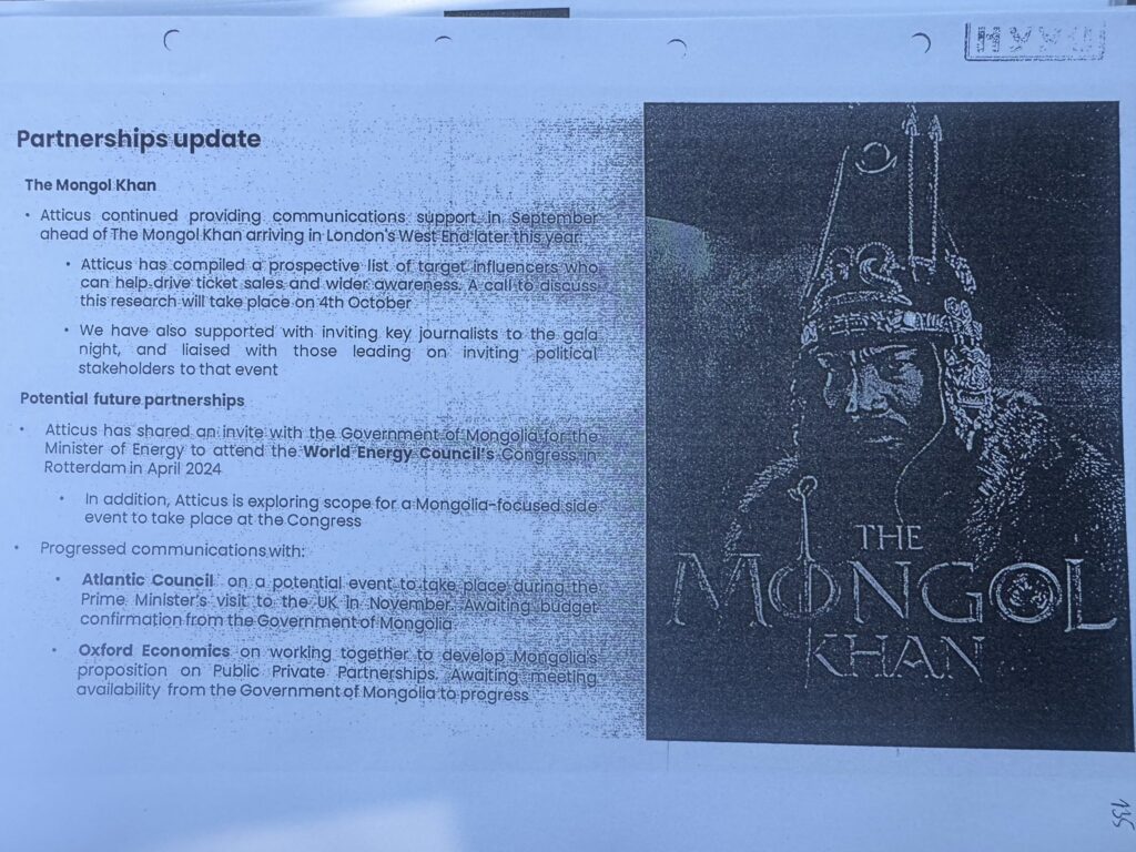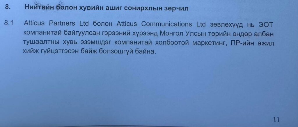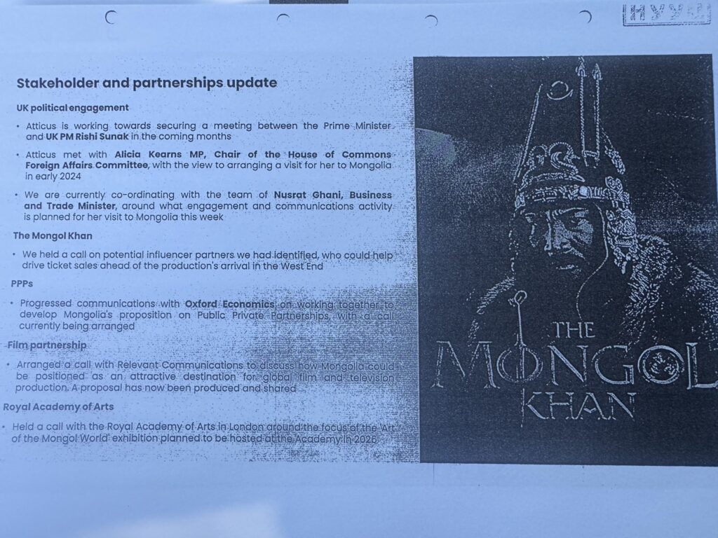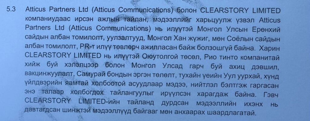 Монгол Улсын дотоод улс төрийн мэдээллүүд сүүлийн 2-3 жилд гадаадын хэвлэл мэдээллийн байгууллагуудад их гардаг, гадаад сурталчилгааны давтамж өндөр болсныг Та бүхэн мэднэ. Үүний зардал мөнгө харин хаанаас санхүүждэг байсныг хэн ч мэддэггүй. Тэгвэл Монголын ард түмний өмч болсон төрийн өмчийн компаниас НУУЦ гэрээ хийгдэж энэ бүх ПР, сурталчилгаа хийгддэг байсан нь дараахь баримтаар нотлогдоно.