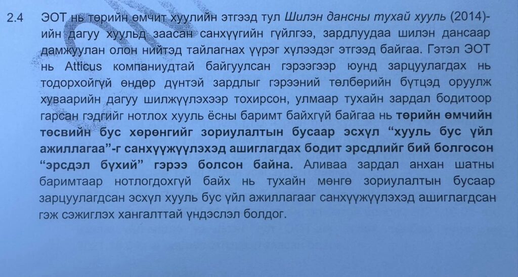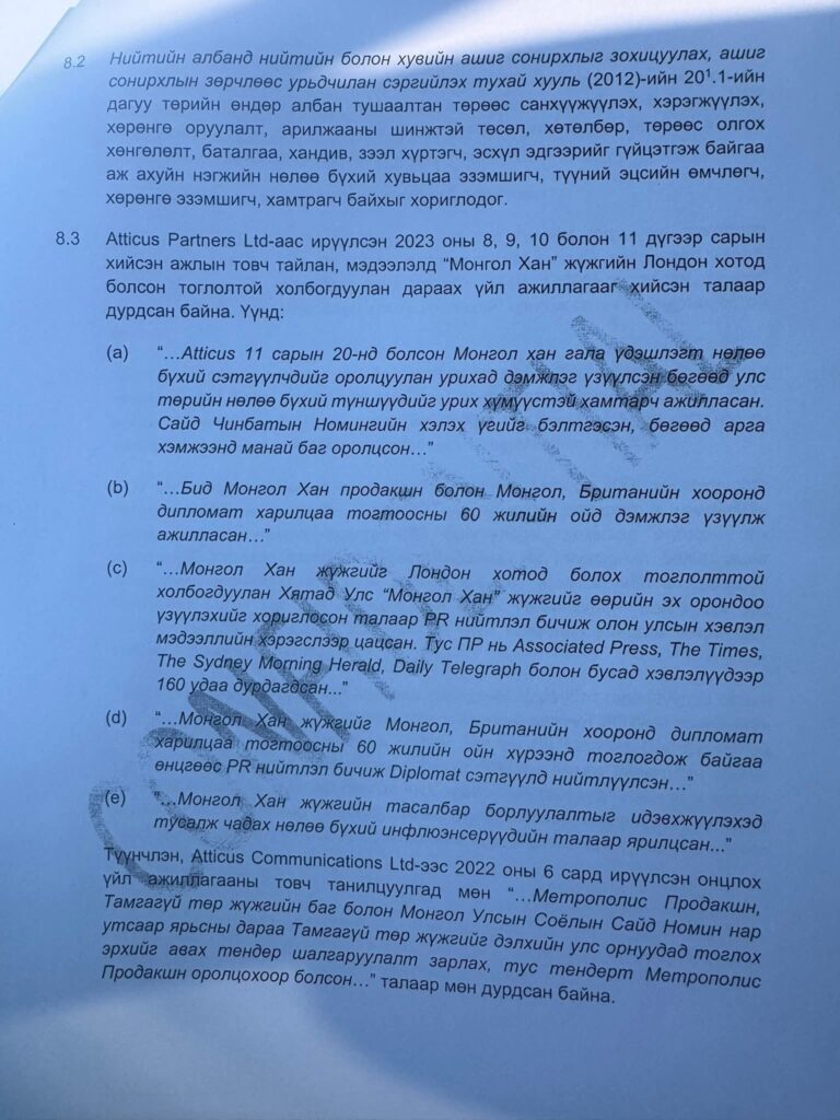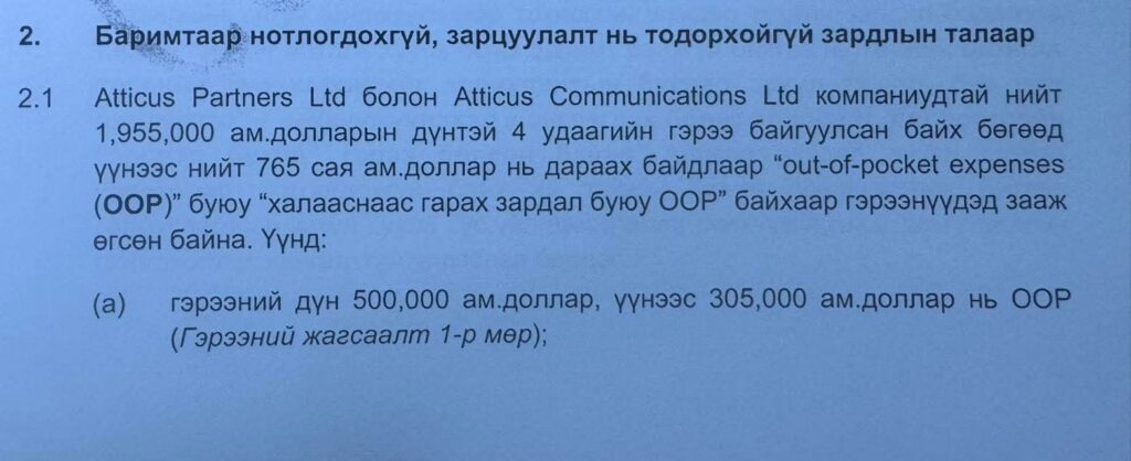 Нэг. Эрдэнэс-Оюу толгой компани нь Л.Оюун-Эрдэнийн Засгийн газрын “шийдвэр”-ийн дагуу гэдэг нэрийдлээр гадаад улсын Atticus Partners Ltd болон Atticus communications Ltd компанитай 4 удаагийн үйлдлээр нийт 1.9 сая ам доллараар(7 орчим тэрбум төгрөг) гэрээ хийж “дэлхийд Монголыг сурталчлах” гэсэн халхавчаар Монгол Улсын Ерөнхий сайд асан Л.Оюун-Эрдэнийн 50 хувь эзэмшдэг Херо энтертэйнмент компанийн бүтээл “Монгол хаан” жүжгийн гадаад сурталчилгааг хийсэн нь баримтаар тогтоогдов.