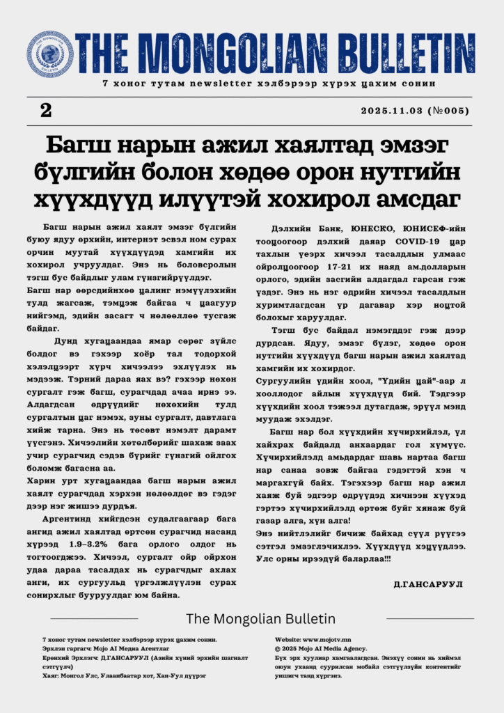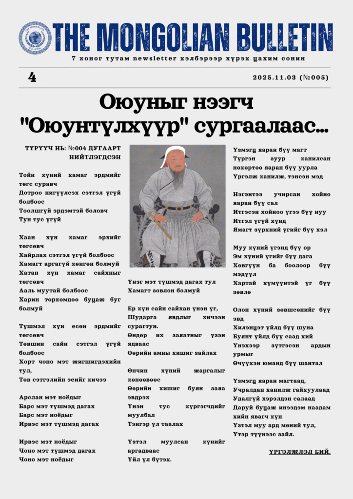 7 хоног тутам newsletter хэлбэрээр уншигч танд хүрдэг “The Mongolian Bulletin” цахим сонины шинэ — №005 дугаар бэлэн боллоо.