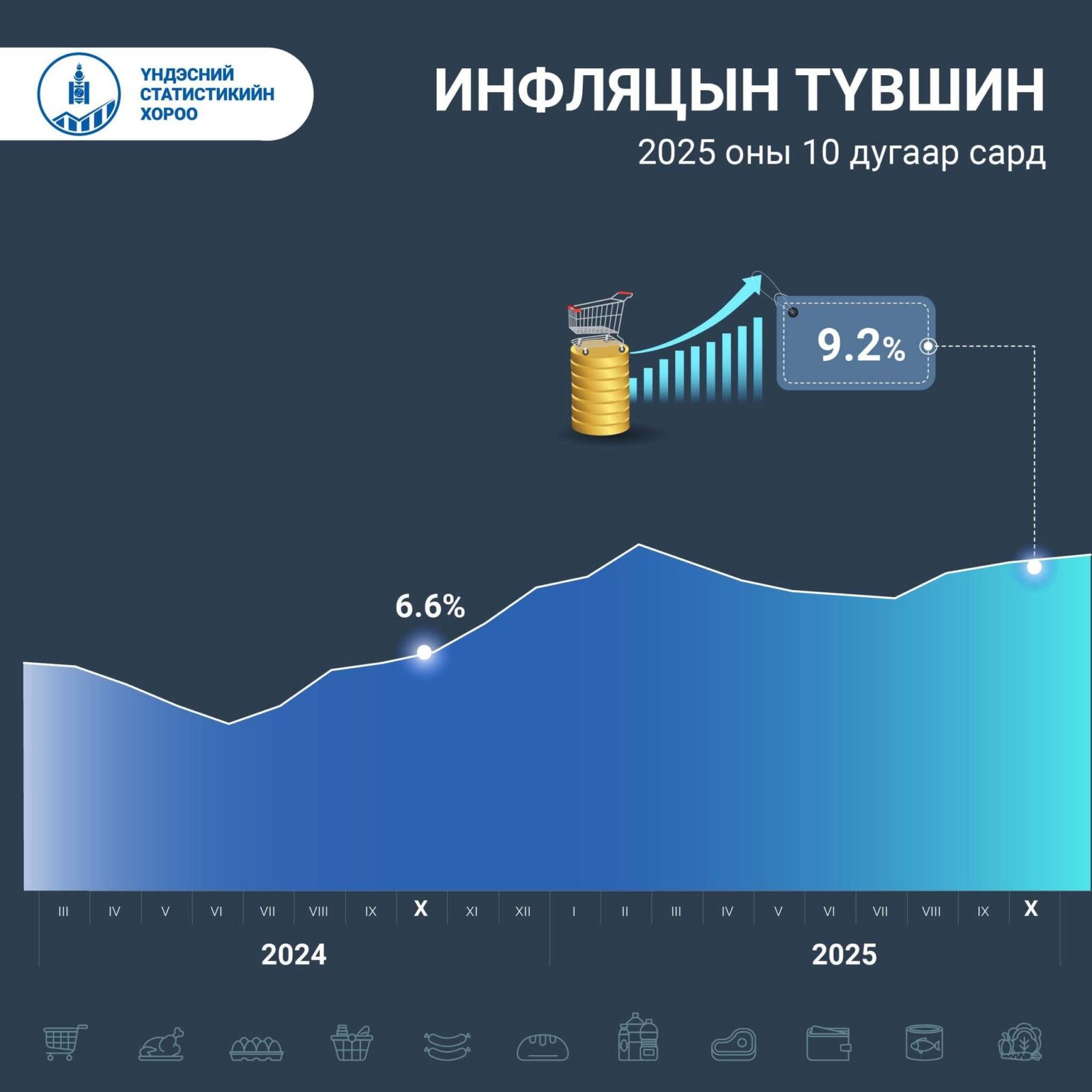 Хэрэглээний бараа, үйлчилгээний үнэ 2025 оны 10 дугаар сард улсын хэмжээнд өмнөх оны мөн үеэс 9.2 хувиар, өмнөх сараас 0.6 хувиар тус тус өссөн байна.