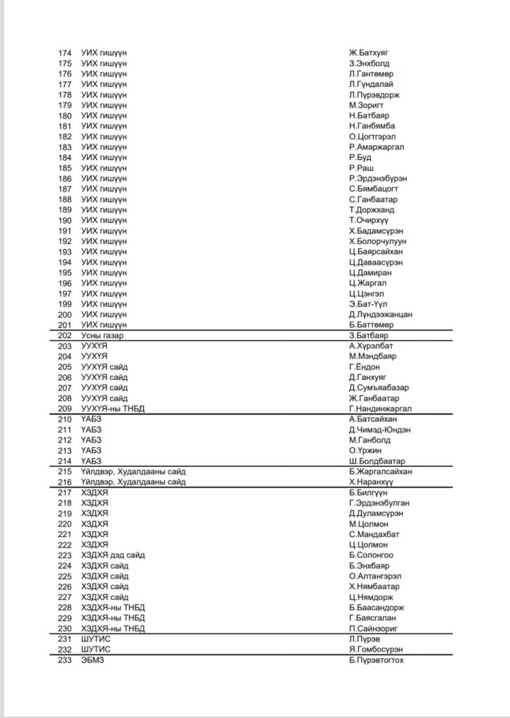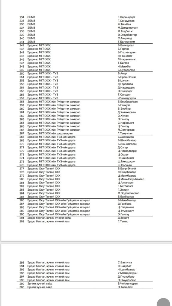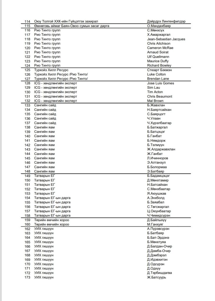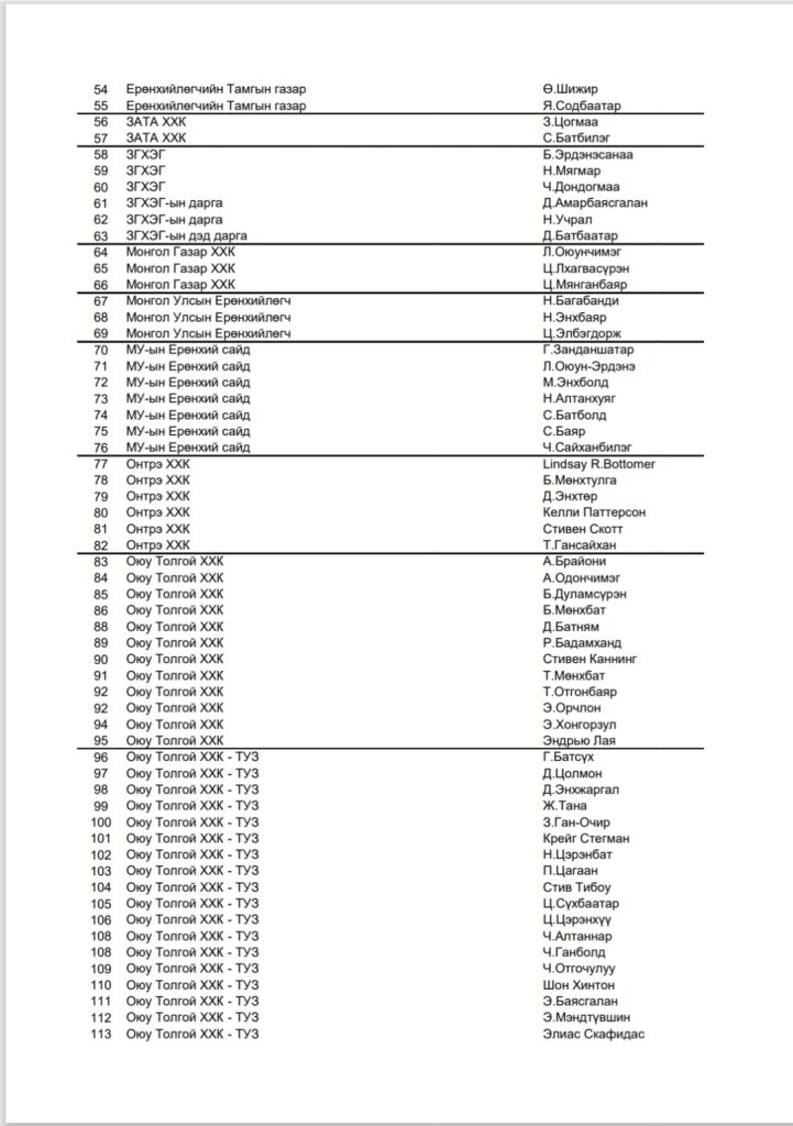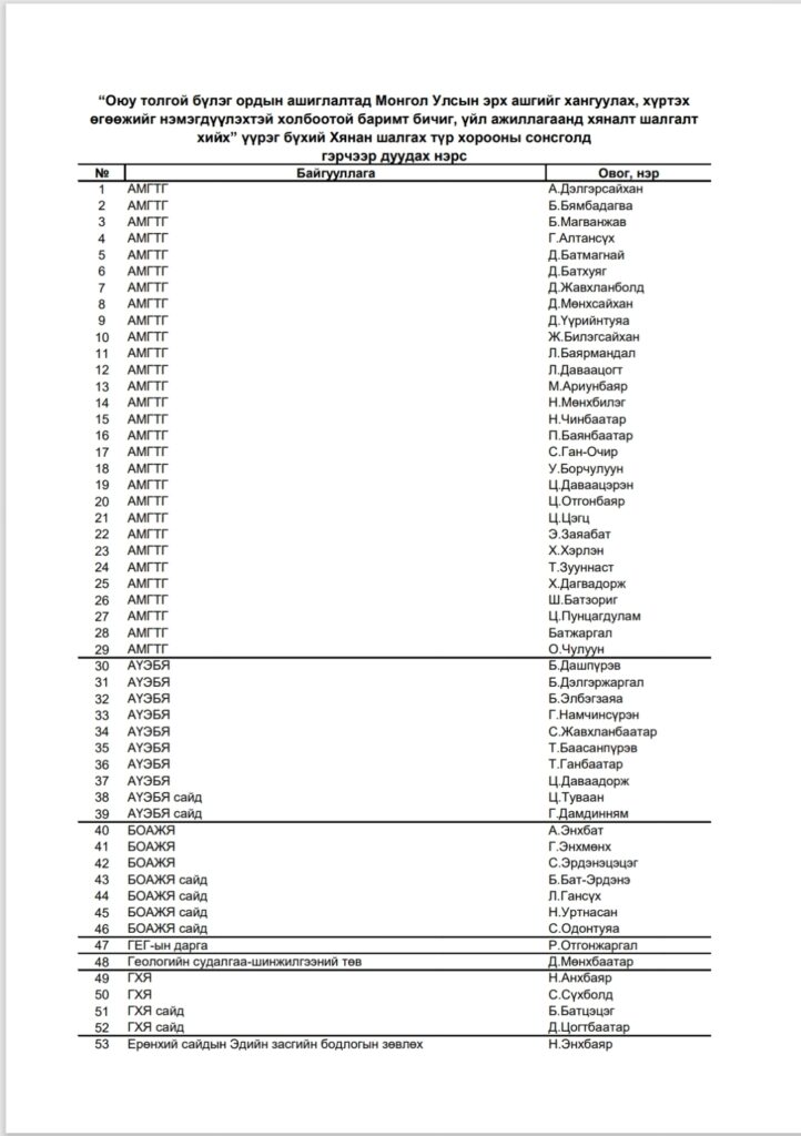 “Оюутолгой бүлэг ордын ашиглалтад Монгол Улсын эрх ашгийг хангуулах, хүртэх өгөөжийг нэмэгдүүлэхтэй холбоотой баримт бичиг, үйл ажиллагаанд хяналт шалгалт хийх” үүрэг бүхий Хянан шалгах түр хорооны сонсголд гэрчээр дуудах нэрс: