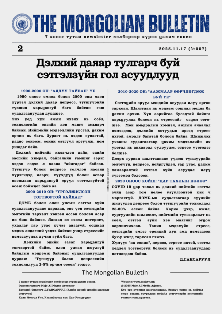 7 хоног тутам newsletter хэлбэрээр уншигчдадаа хүрдэг The Mongolian Bulletin дижитал сонины №007 дугаар Уншигч, Захиалагч танд хүрч байна.