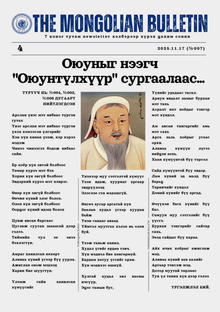 Эзэн Чингис хааны “Оюунтүлхүүр” сургаал цувралаар хүрч байгаа. Оюуны шим болсон сургаалиа уншаарай.