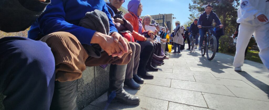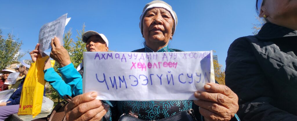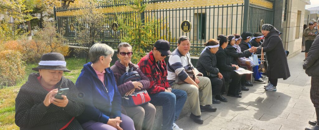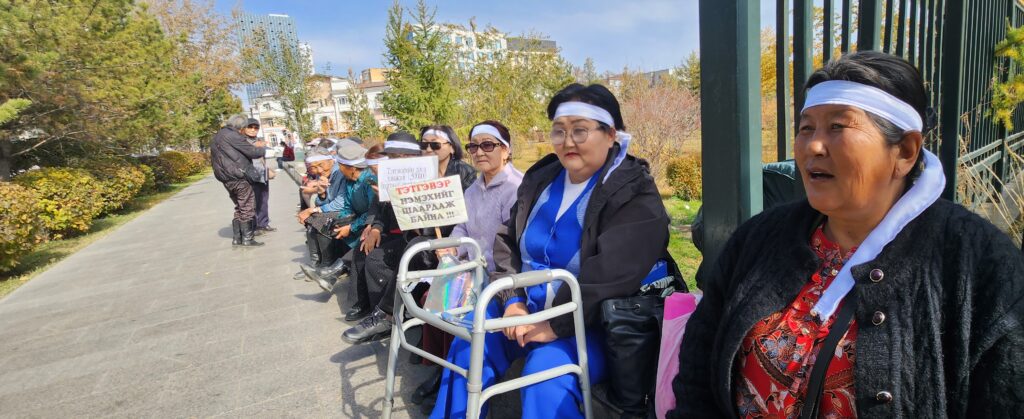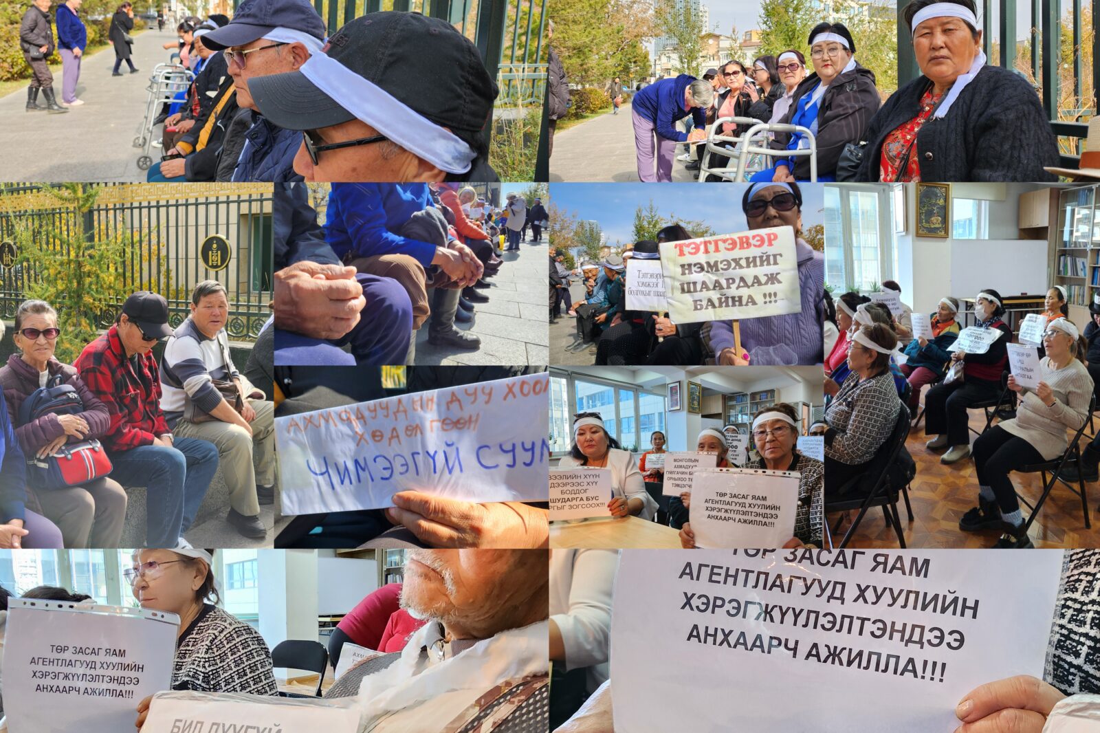 Монголын ахмадууд тэтгэврийн доод хэмжээг 1.500.000 төгрөг болгохыг шаардаж энэ оны зургадугаар сарын 19-нээс эхэлж Төрийн ордны баруун хаалган дээр “Чимээгүй суулт” зарласан. Өдөр алгасахгүй шахуу сууцгаасан. Зуны аагим, бороо, намрын сэрүүн, жавар, бүр цастайд ч 60-80 гаруй настай ахмадууд хүйтэн чулуун дээр хайрагдан өдрийг өнгөрөөж байна.