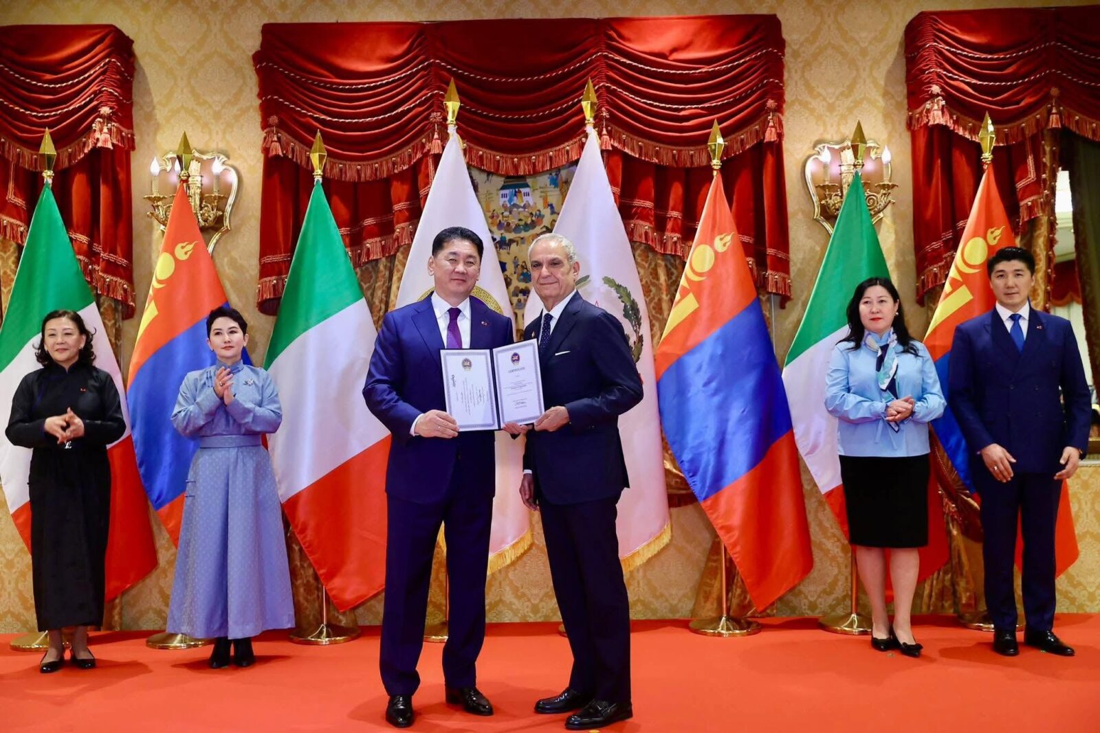 Ерөнхийлөгч зарлиг гарган, Монгол, Италийн харилцаа, хамтын ажиллагааг өргөжүүлэн хөгжүүлэхэд үнэтэй хувь нэмэр оруулсан итали, монгол иргэдийг төрийн одон, медалиар шагналаа.